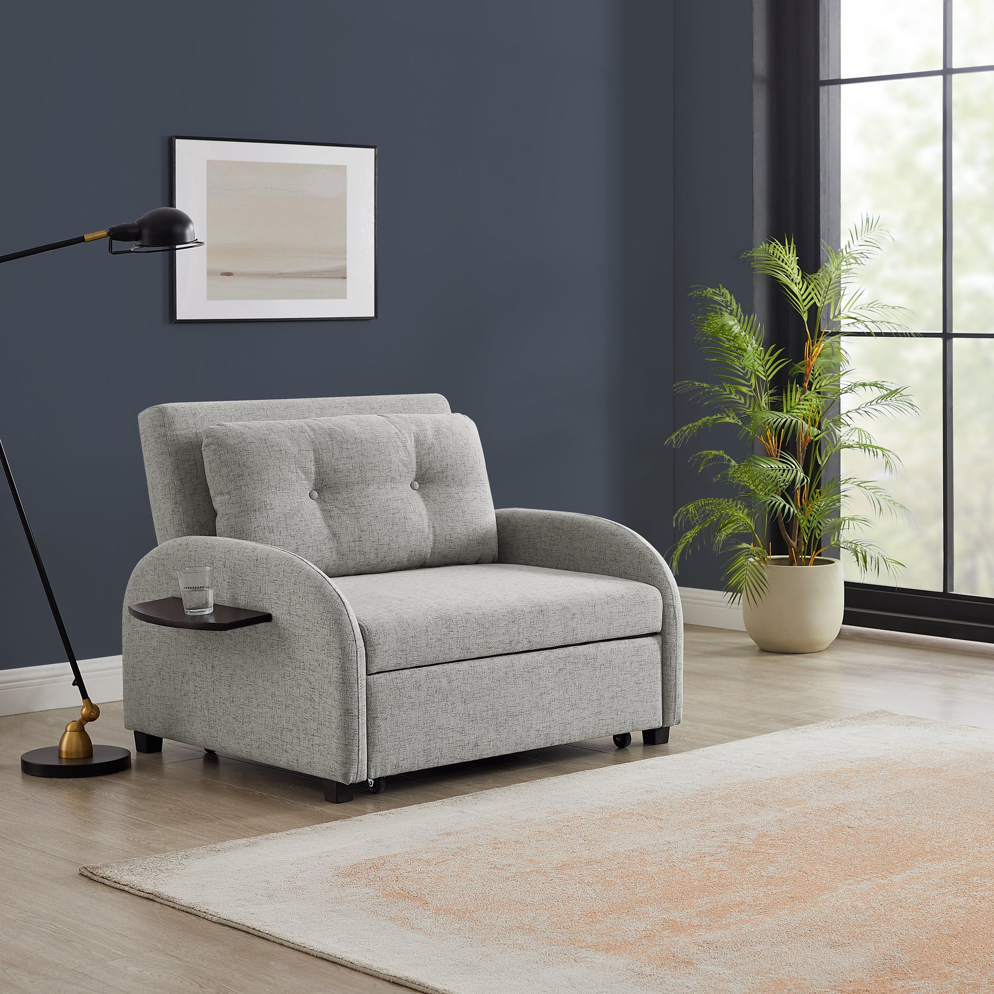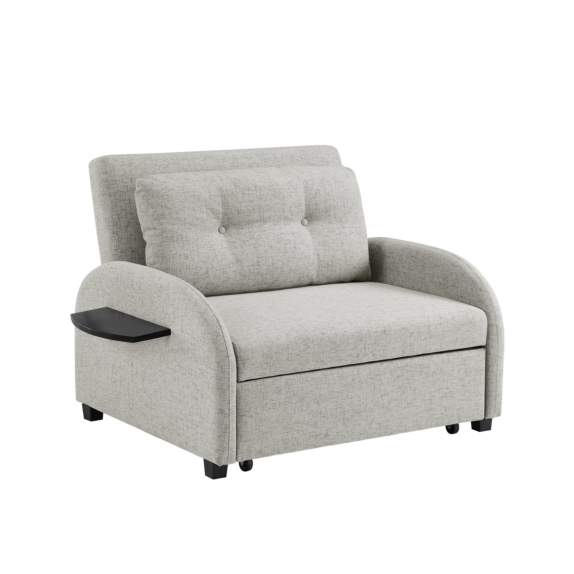 Plongez dans un confort absolu toute la journée avec ce large fauteuil-lit convertible, idéal pour se détendre, faire une sieste ou accueillir des invités. Revêtu de polyester gris doux, il se transforme d'abord en un fauteuil spacieux en un lit confortable grâce à sa poignée en similicuir lisse. Ses accoudoirs incurvés créent une courbe douce qui adoucit la silhouette et favorise une position allongée relaxante. Le coussin capitonné inclus apporte un confort supplémentaire ou peut être retiré pour un style plus épuré. Une tablette latérale rabattable permet de garder boissons, livres ou appareils électroniques à portée de main, faisant de ce meuble un objet aussi pratique que confortable.