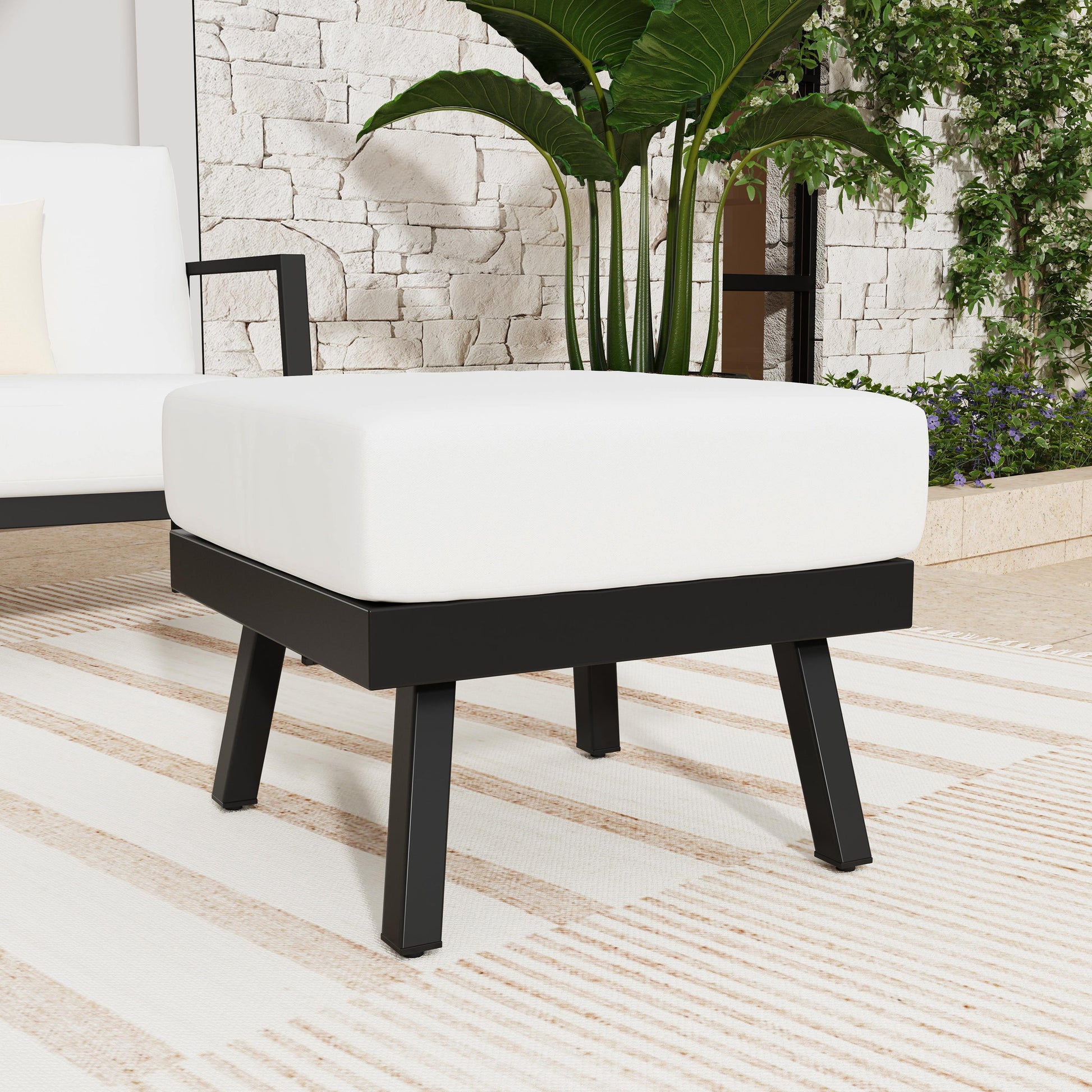 Allongez vos jambes et détendez-vous toute l'année grâce à ce pouf d'extérieur. Sa structure robuste en aluminium, revêtue d'une peinture en poudre noire antirouille, allie style moderne et durabilité. Son coussin épais et moelleux, recouvert de tissu Sunbrella noir, est résistant à la décoloration, aux taches et aux moisissures, pour un confort optimal et une longue durée de vie. Utilisé comme repose-pieds ou siège d'appoint, ce pouf est l'accessoire indispensable dont vous ignoriez l'existence. Une gamme de meubles assortis est également disponible pour créer un ensemble complet.
