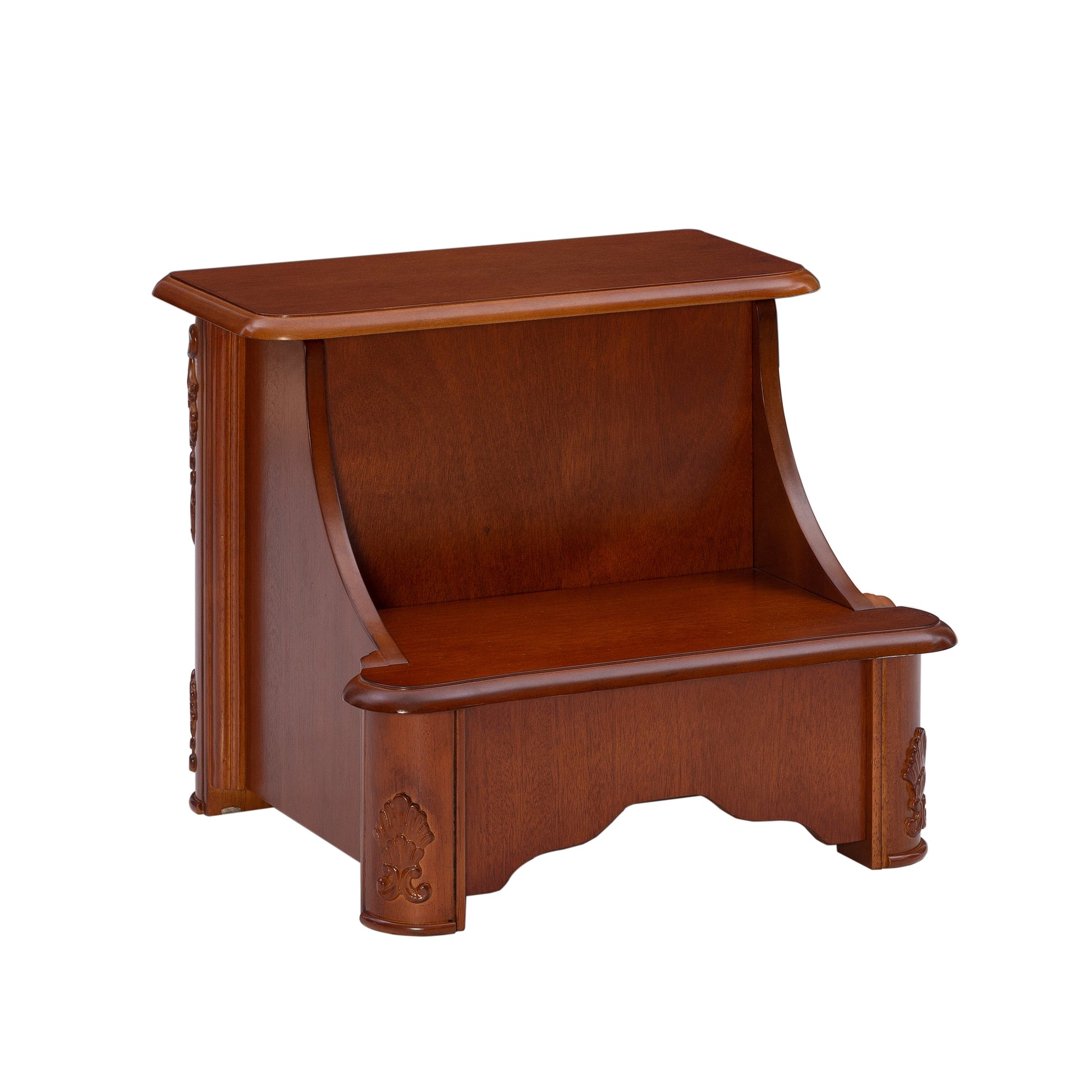 Ces marches de lit en acajou massif présentent des montants d'angle sculptés en acanthe, des surfaces plaquées en acajou veiné, une traverse avant festonnée et sont fabriquées en bois dur de qualité supérieure. La marche se déplie pour révéler un profond compartiment de rangement. Assemblage partiel requis.