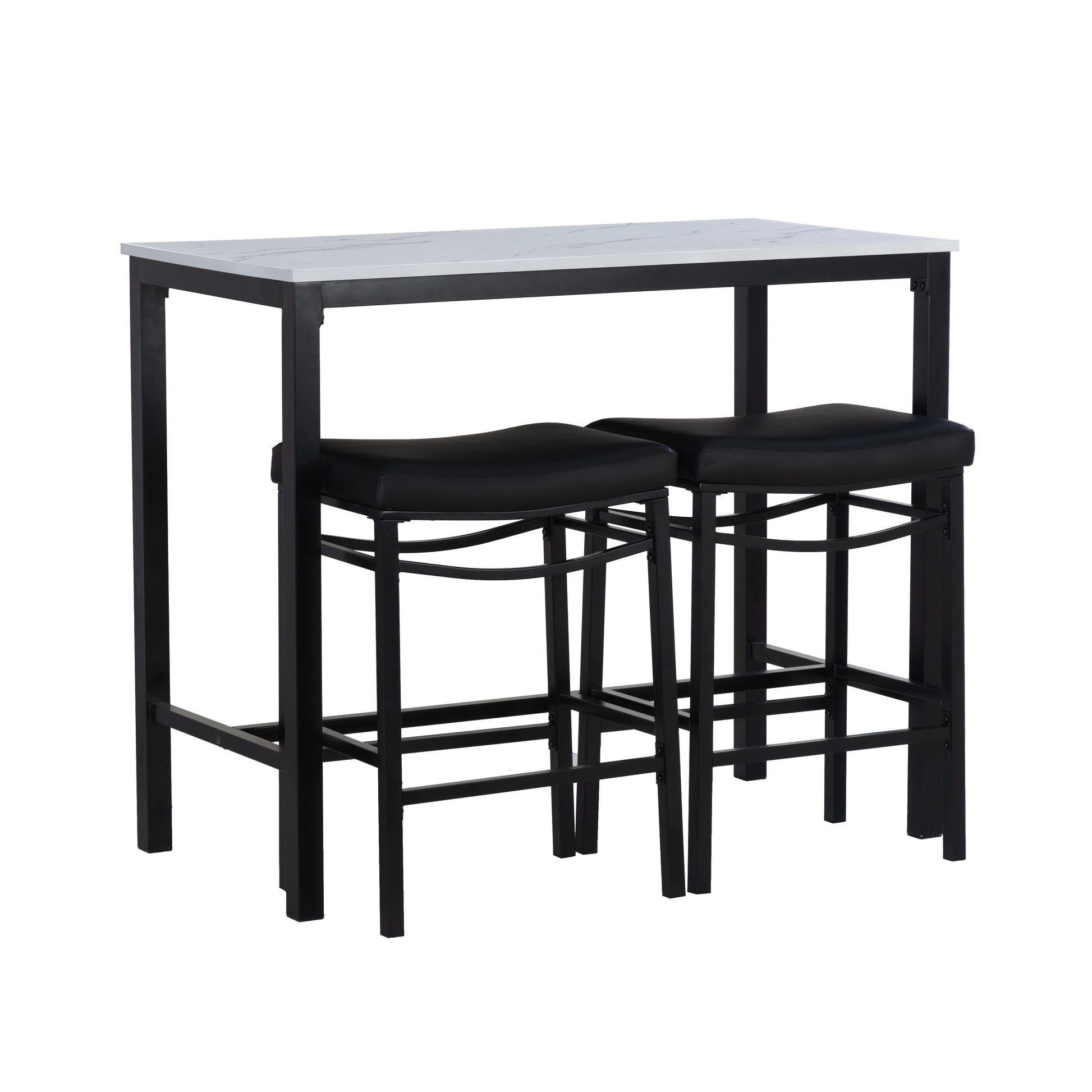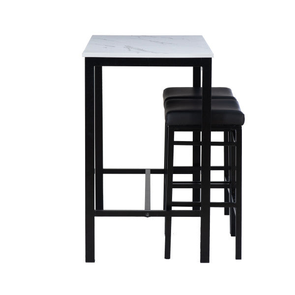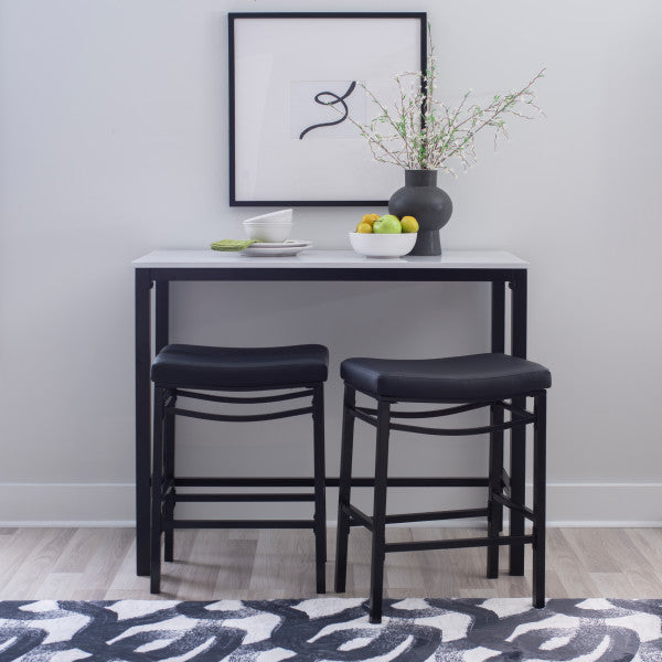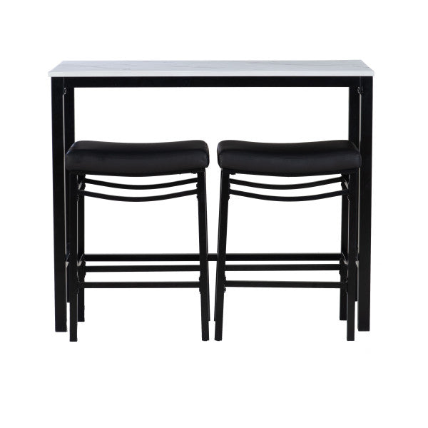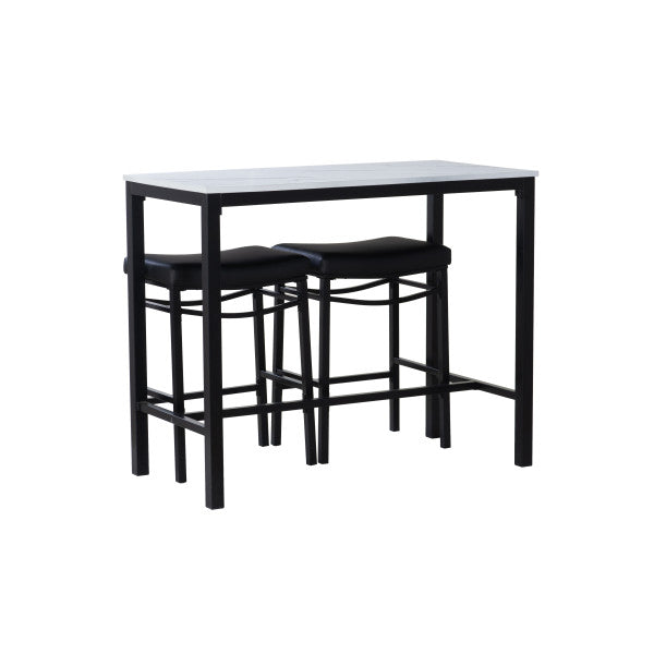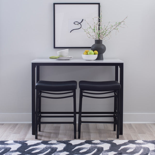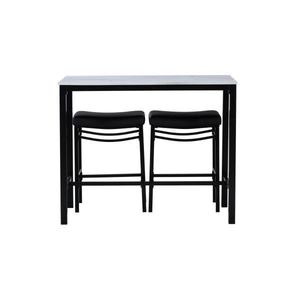 Transformez votre salle à manger ou votre espace de détente avec cet ensemble 3 pièces en similicuir, comprenant une table élégante et deux tabourets confortables qui se rangent facilement dessous. La table (112 cm L x 56 cm P x 91 cm H) possède un plateau en MDF recouvert de papier marbré et d'un placage en frêne pour un style moderne. Le piètement, disponible en métal noir, gris anthracite ou marron, est recouvert d'une peinture en poudre pour une durabilité accrue. Les tabourets, quant à eux, offrent un design élégant sans dossier et des assises de type selle revêtues de similicuir noir, de tissu gris ou de similicuir marron. Fabriqués en contreplaqué et en métal, les tabourets supportent une charge maximale de 159 kg et mesurent 49 cm L x 34 cm P x 65 cm H. Parfait pour les petits espaces, cet ensemble allie style et fonctionnalité, ce qui le rend idéal pour les cuisines, les bars ou les coins repas décontractés.