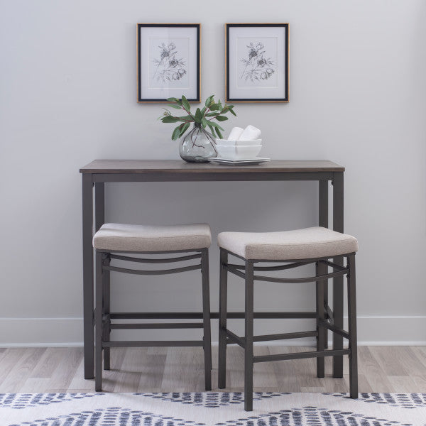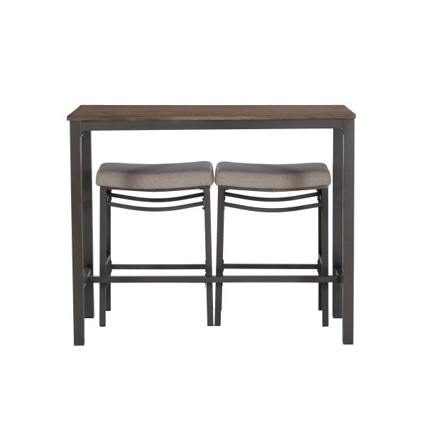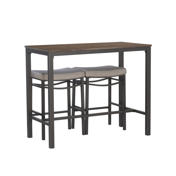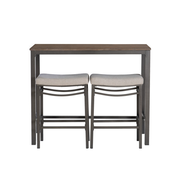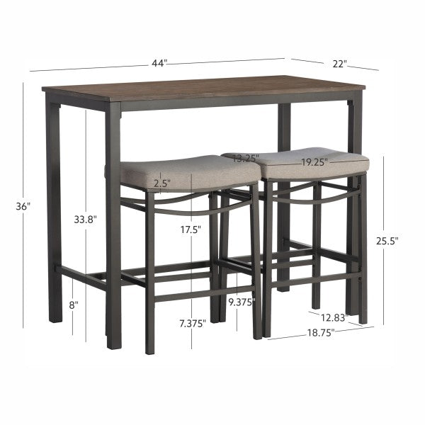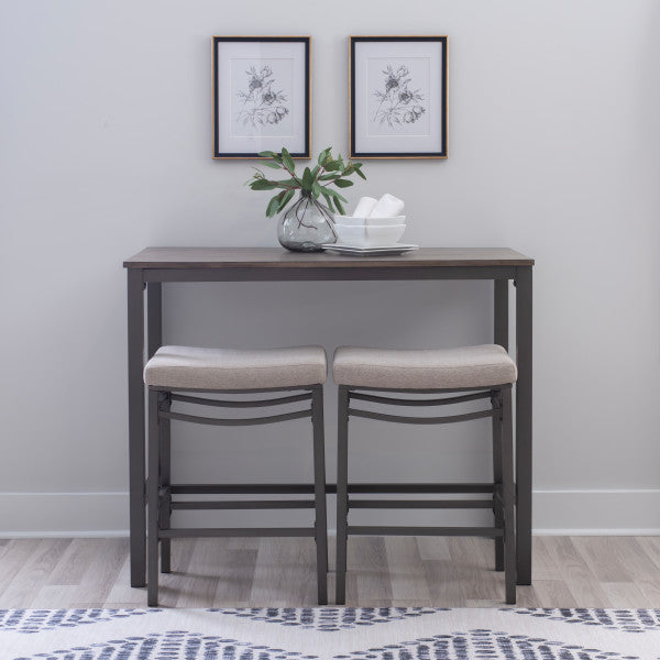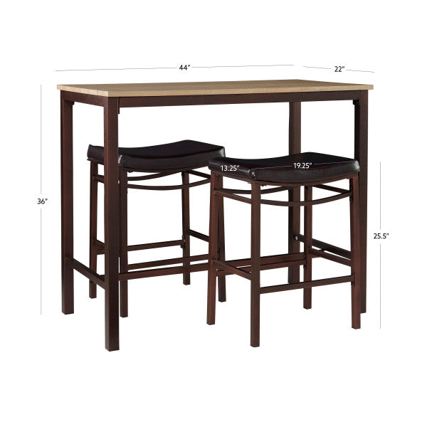 - Cet ensemble de trois pièces comprend une table et deux tabourets.