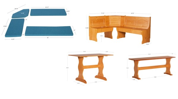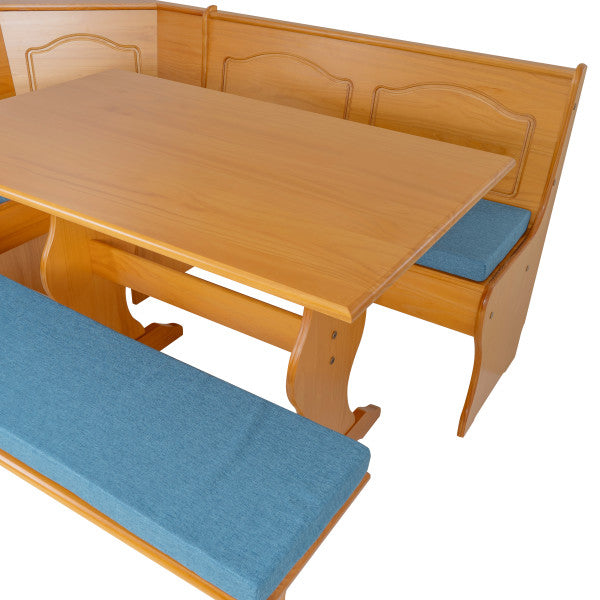 Créez un coin repas convivial et chaleureux dans n'importe quel recoin de votre cuisine. La riche finition pin miel de ce coin repas confère un style traditionnel à ce meuble très fonctionnel. Le banc d'angle et le banc indépendant peuvent accueillir confortablement cinq personnes. Vous pouvez choisir l'orientation du coin repas lors de son montage. Livré avec un ensemble de quatre coussins en tissu bleu ou beige, il deviendra un lieu de rassemblement idéal pour la famille, que ce soit dans la cuisine, la salle à manger ou le coin repas.