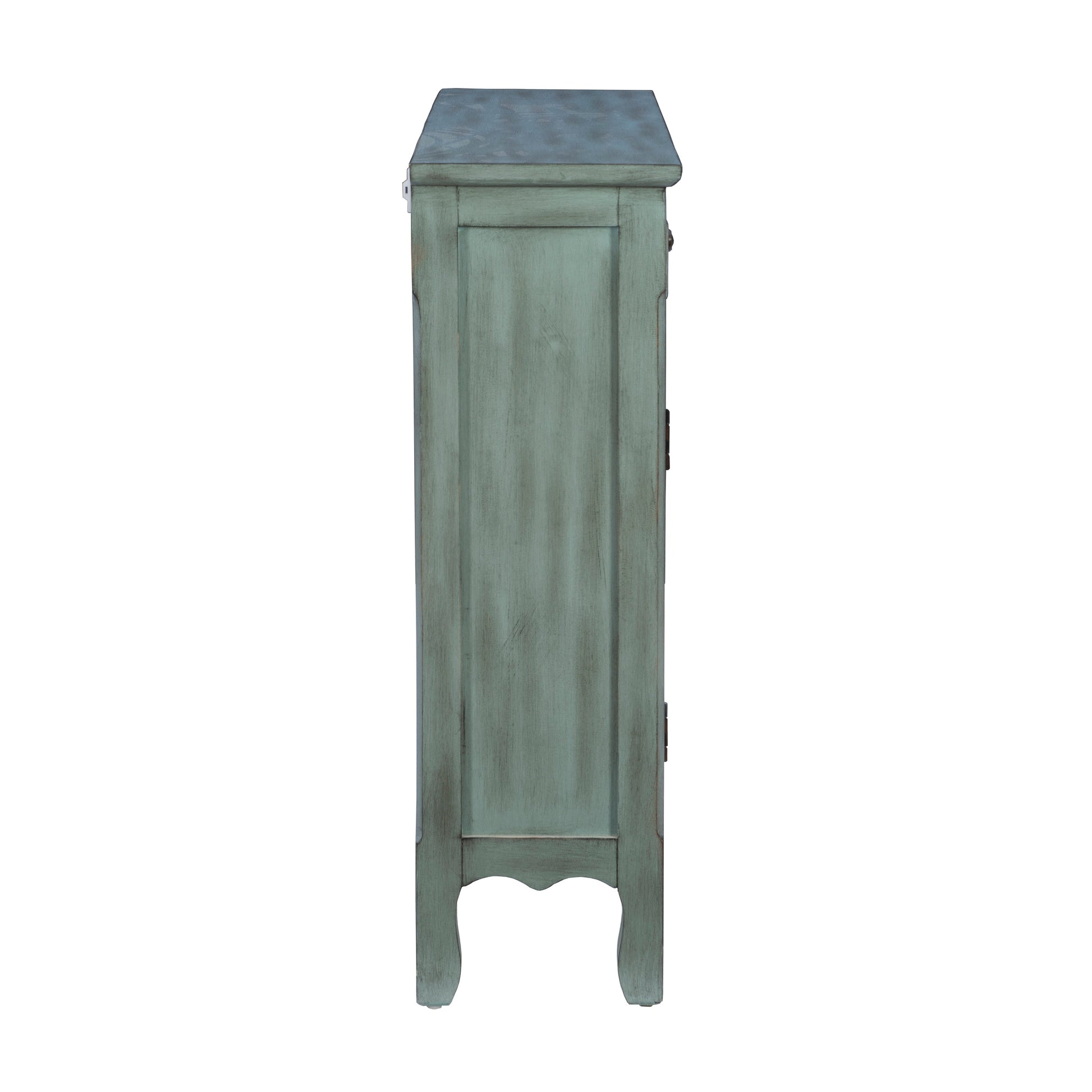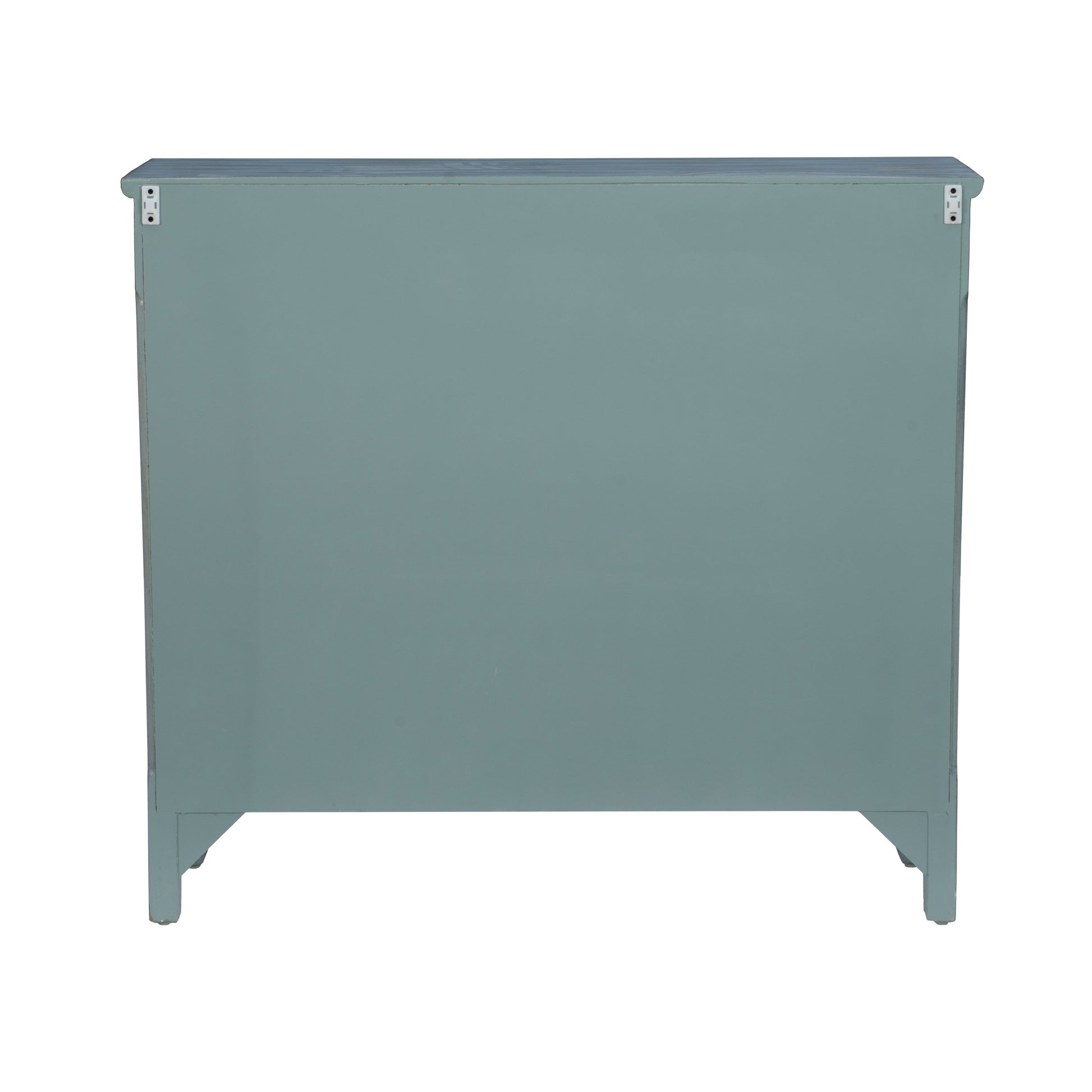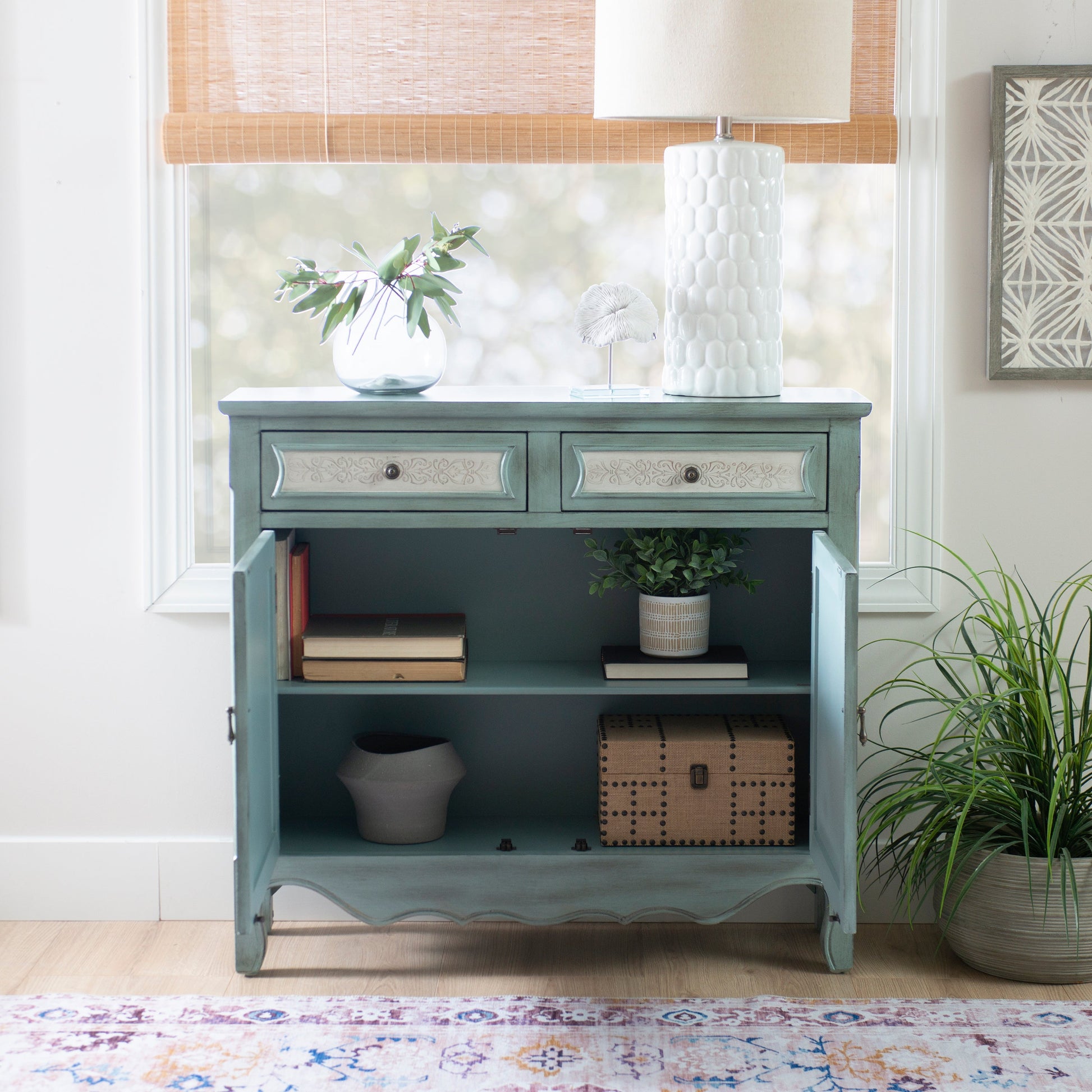 Cette console bleu antique aux lignes épurées apporte sophistication et élégance à toute pièce. Son socle incurvé décoratif lui confère une touche de caractère, tandis que des panneaux blancs ornés d'un motif en relief décorent sa façade. La console s'ouvre par deux portes révélant un espace de rangement avec une étagère fixe. C'est le meuble idéal pour une entrée, un couloir ou un salon. Livrée entièrement assemblée.