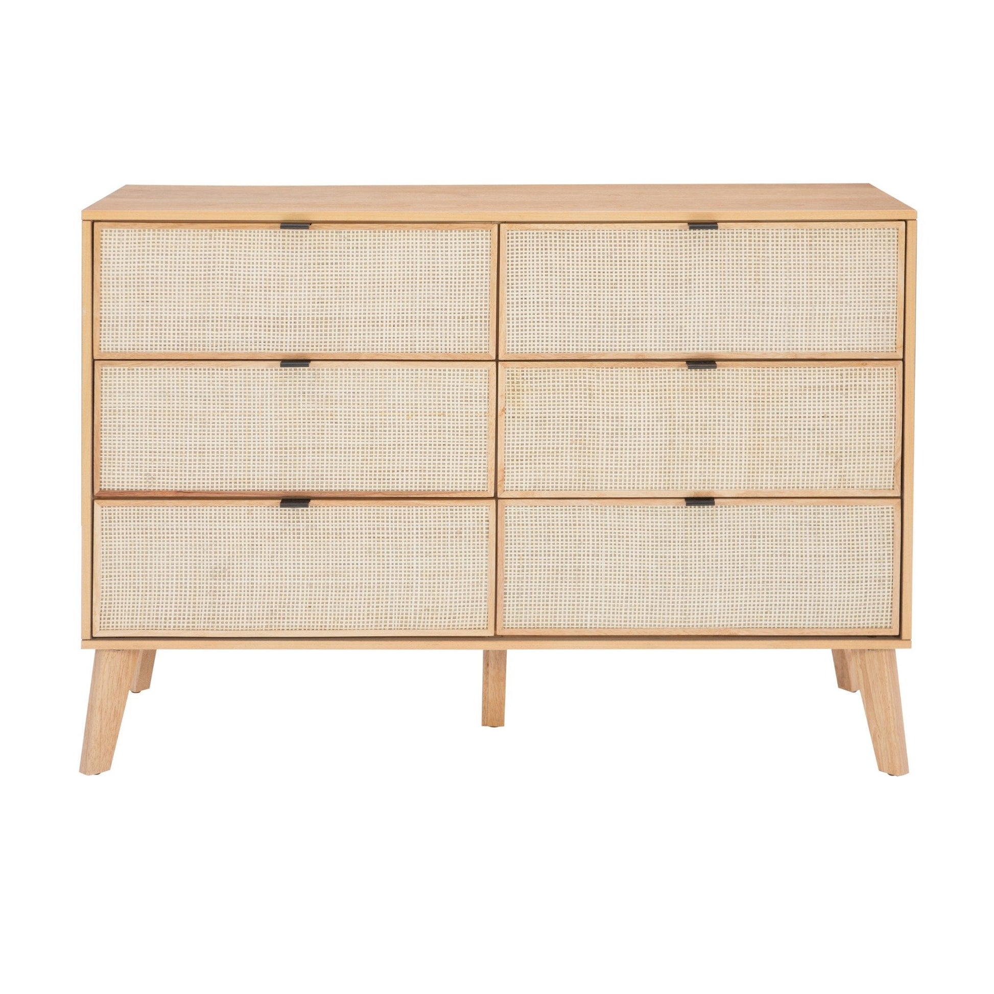 Rafraîchissez votre intérieur avec une commode aussi élégante que fonctionnelle. Ce meuble à six tiroirs allie le charme intemporel du design moderne du milieu du siècle à la chaleur naturelle du rotin tressé. Ses lignes épurées, sa finition en bois naturel et ses poignées de tiroir en métal discrètes créent un style à la fois frais et sophistiqué. Offrant un espace de rangement généreux et un design qui s'intègre à tous les intérieurs, des maisons de bord de mer aux lofts urbains contemporains, cette commode est le parfait compromis entre style et praticité, pour un intérieur serein et ordonné.