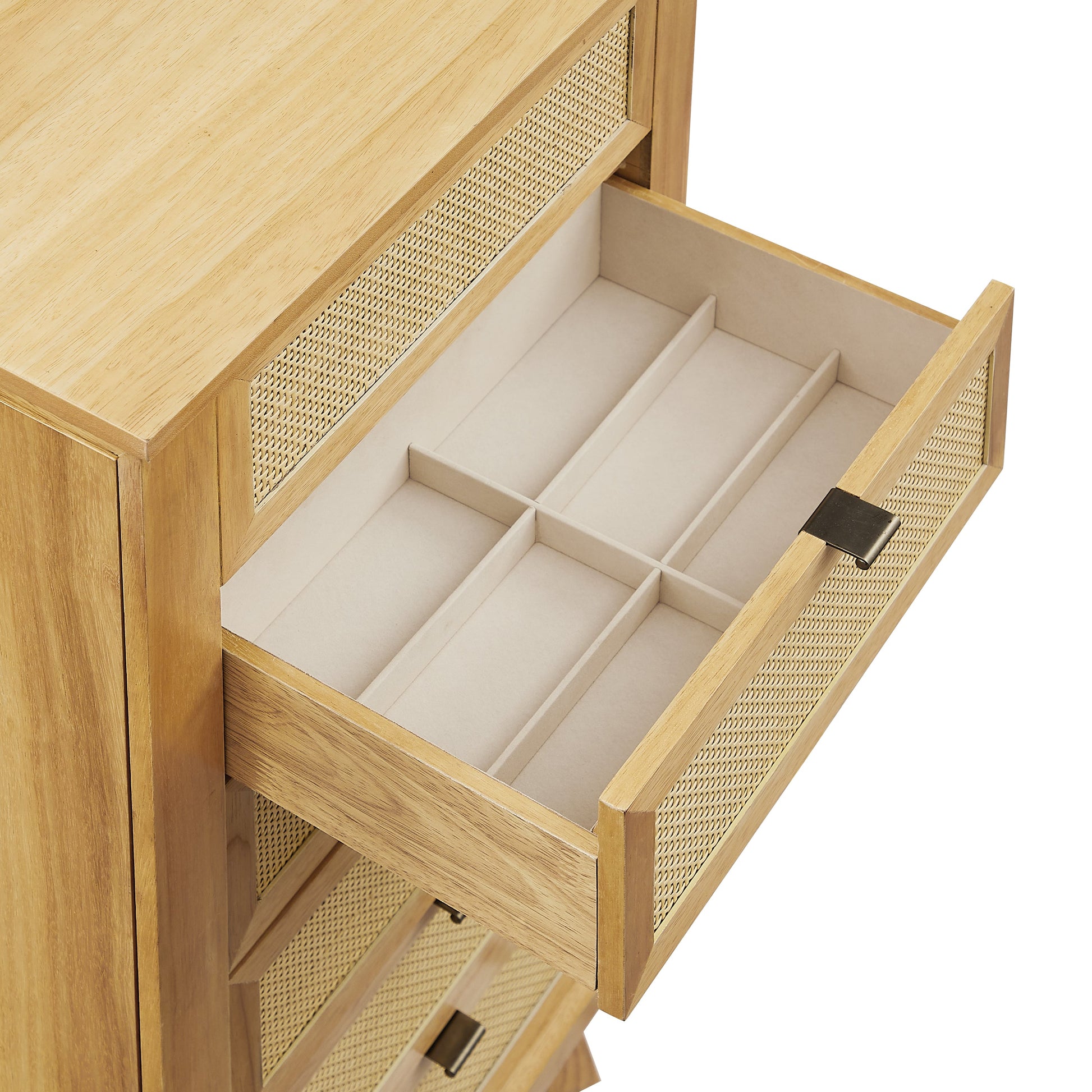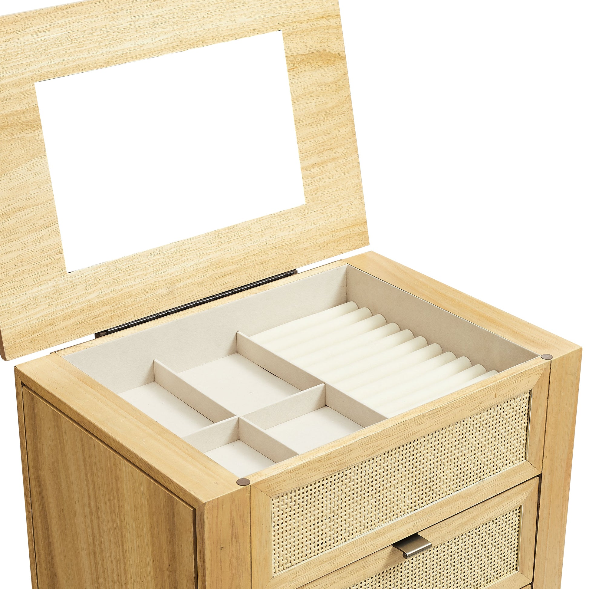 - Tiroirs de rangement spacieux : Plusieurs tiroirs offrent un espace généreux pour ranger bagues, boucles d’oreilles, bracelets et autres bijoux.