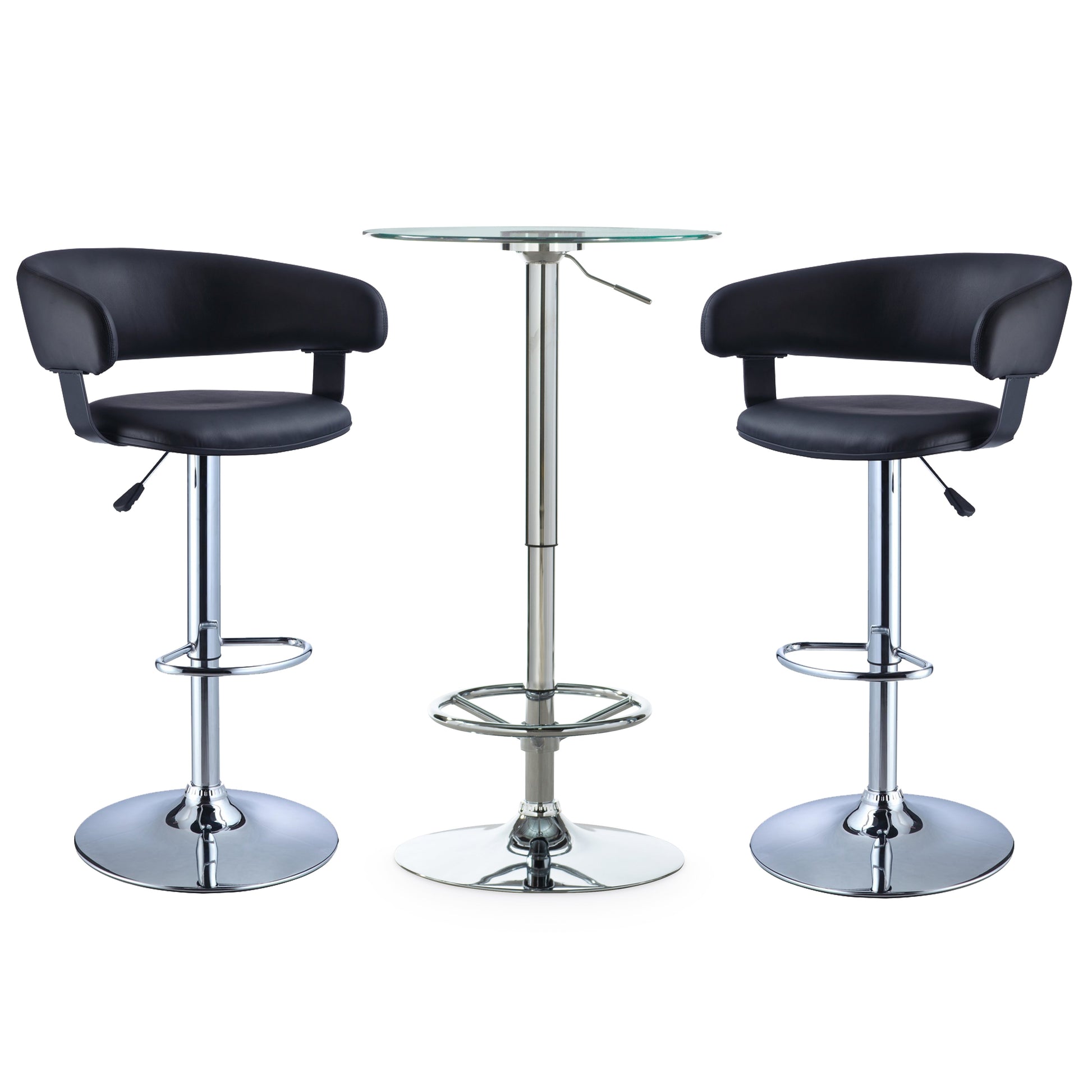 Apportez une touche de modernité à votre espace de vie avec cet élégant ensemble table et chaises trois pièces. Les coussins d'assise moelleux sont revêtus de similicuir noir ou blanc et assortis à des dossiers incurvés pour un confort et une stabilité optimaux. La table, avec son plateau en verre arrondi, et les tabourets reposent sur des pieds circulaires en métal chromé poli, pour une finition brillante et raffinée. Chaque pied est équipé d'un repose-pieds et d'un vérin à gaz, vous permettant d'ajuster facilement la hauteur de l'ensemble et de vous détendre à votre guise. La table supporte jusqu'à 45 kg, tandis que chaque tabouret supporte jusqu'à 102 kg. L'ensemble est livré en parfait état, avec un minimum d'assemblage.