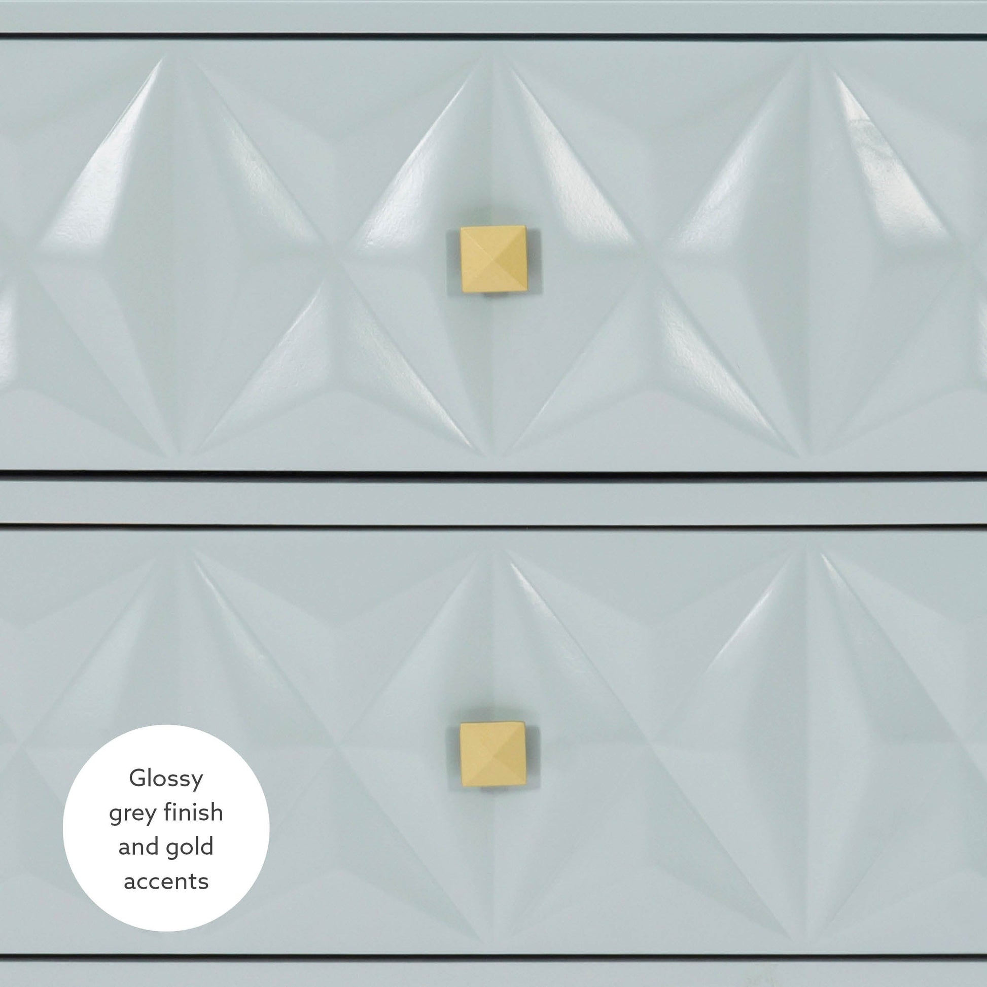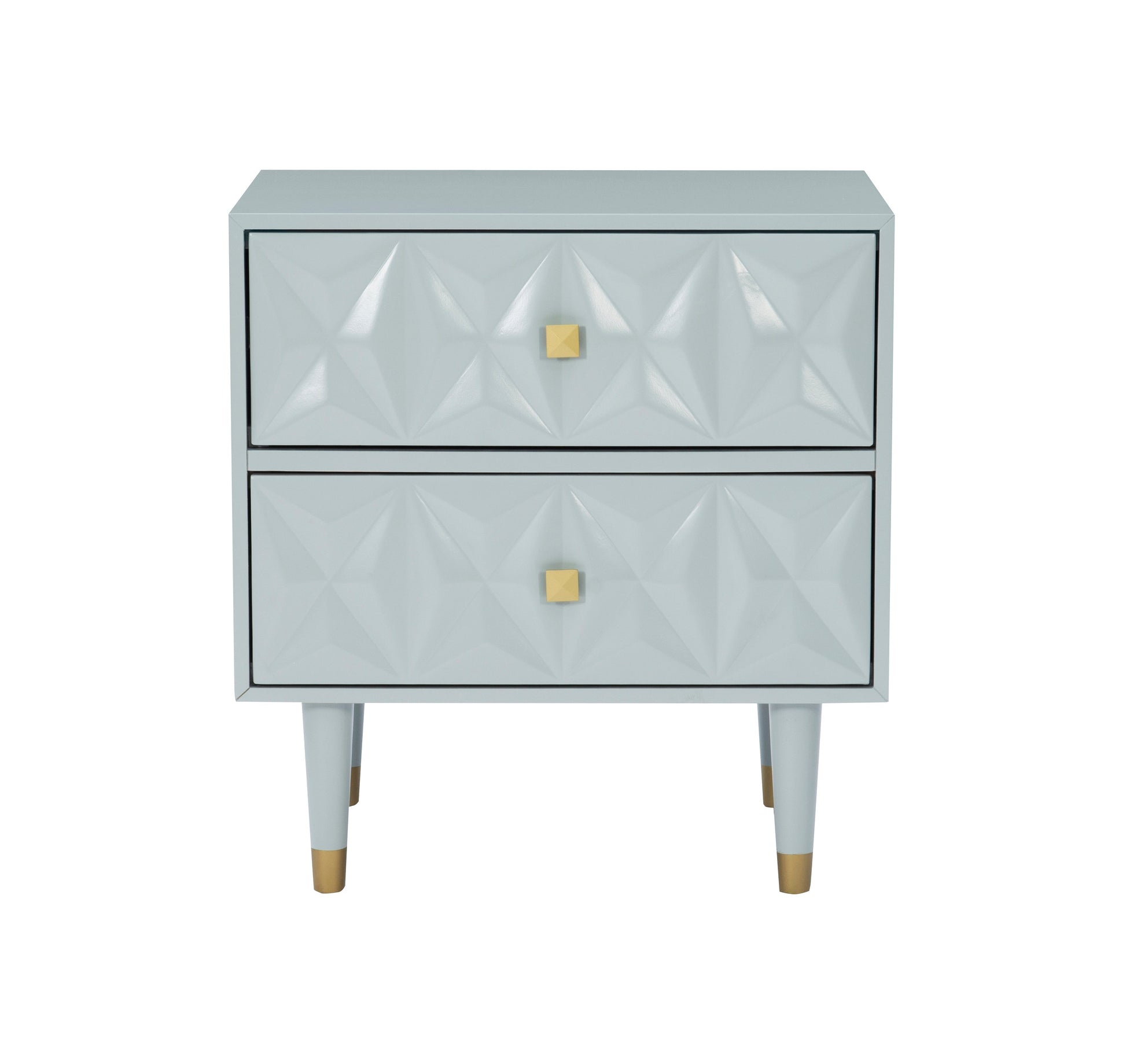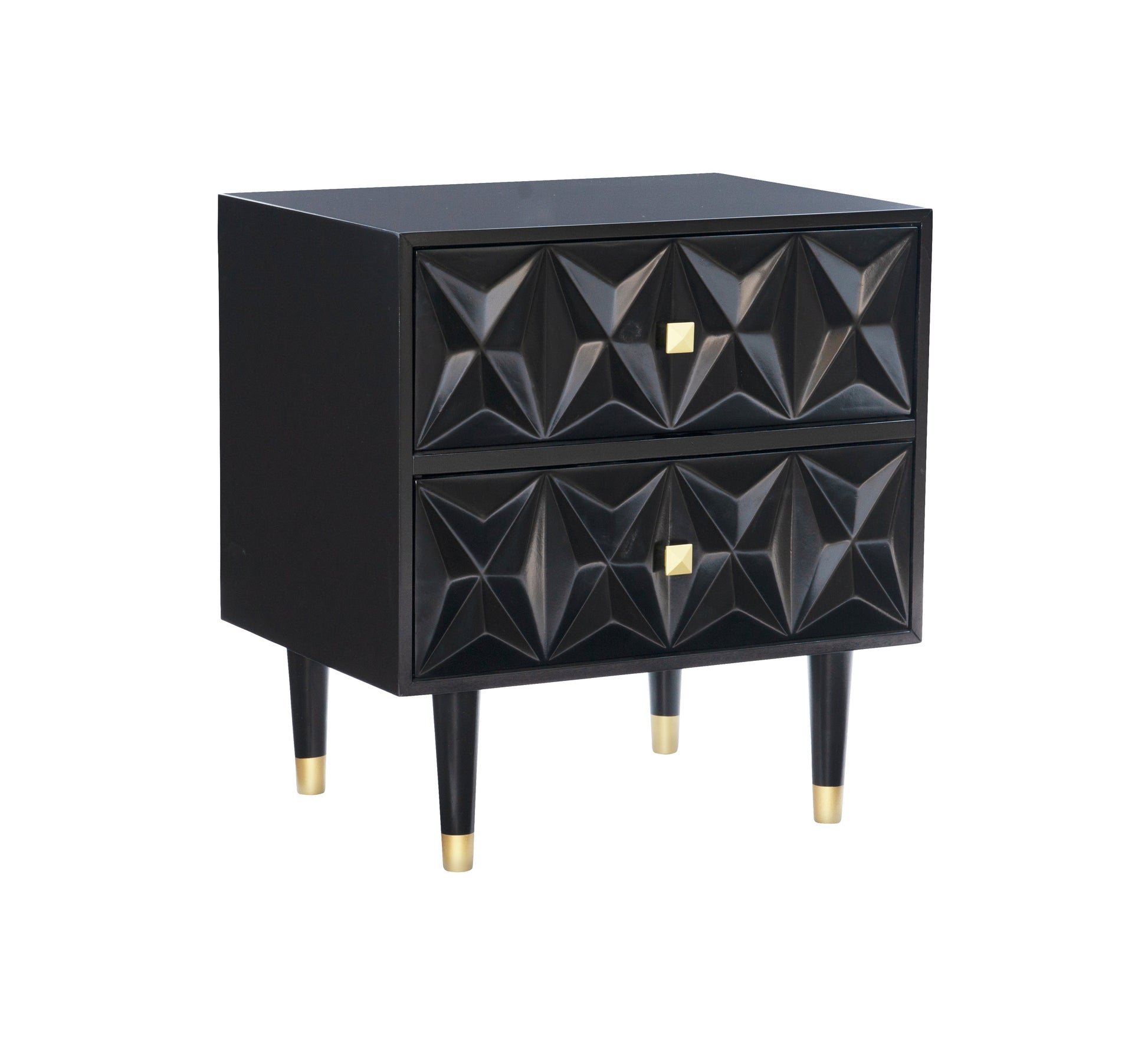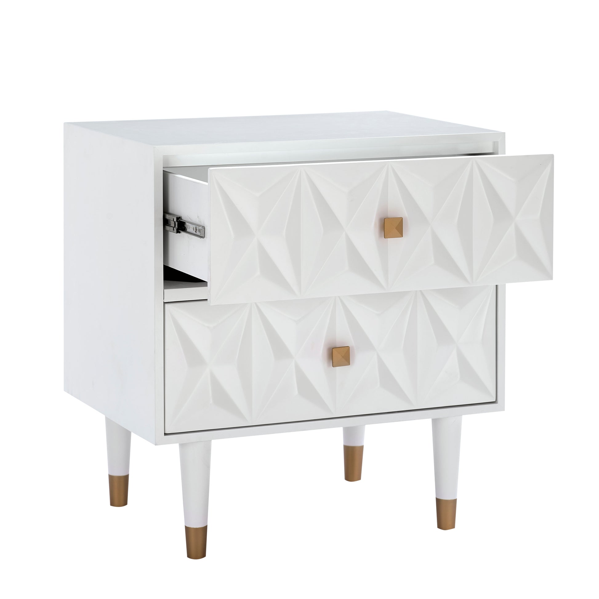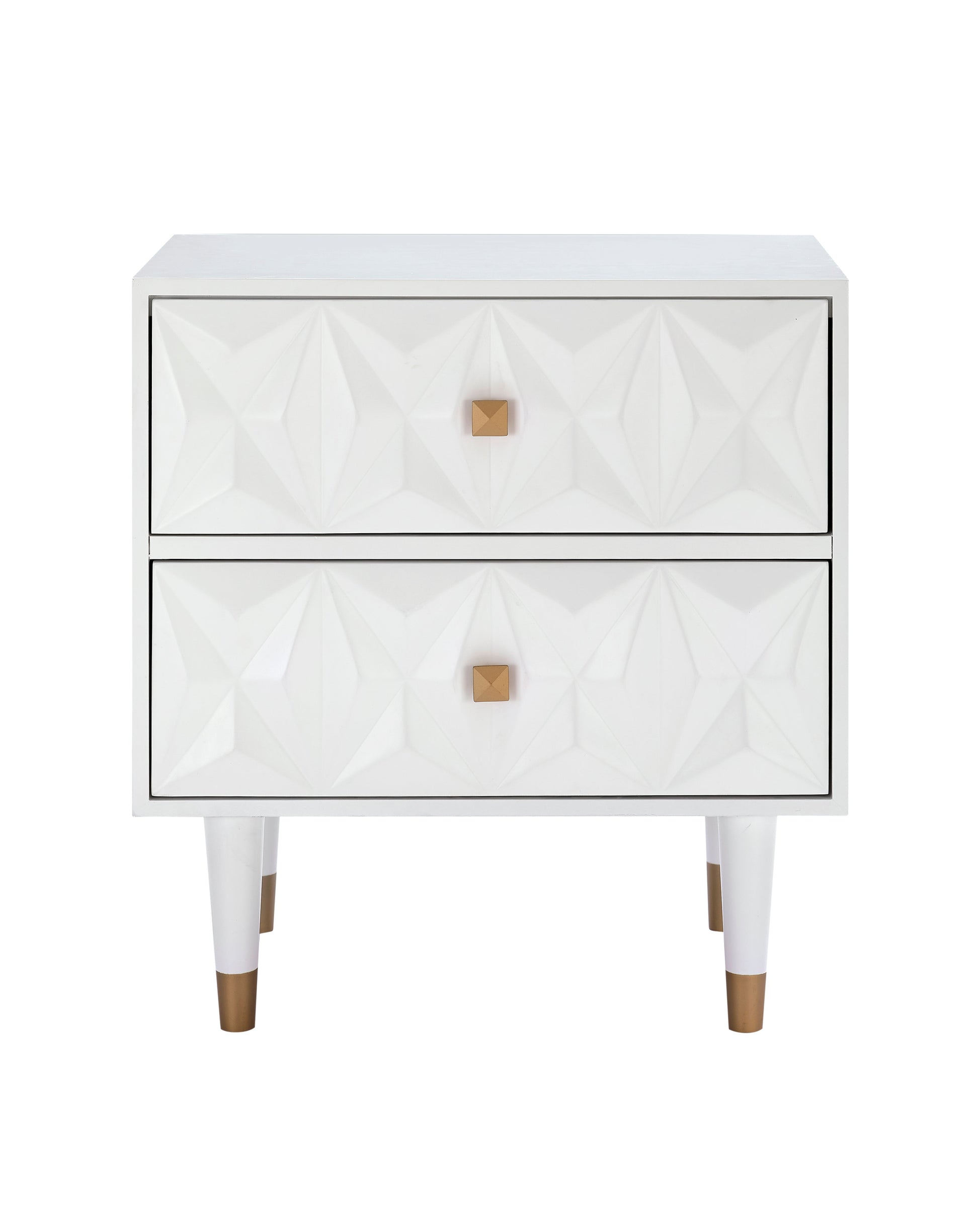 Avec sa façade à motifs géométriques, cette table de chevet apportera texture et profondeur à votre chambre. Sa façade texturée est ornée de poignées carrées dorées et de pieds ronds plaqués or. Un véritable atout charme ! Deux tiroirs profonds offrent un espace de rangement généreux pour vos livres, appareils électroniques et autres objets. Sa finition lui permet de s'intégrer facilement à tout type de décoration.