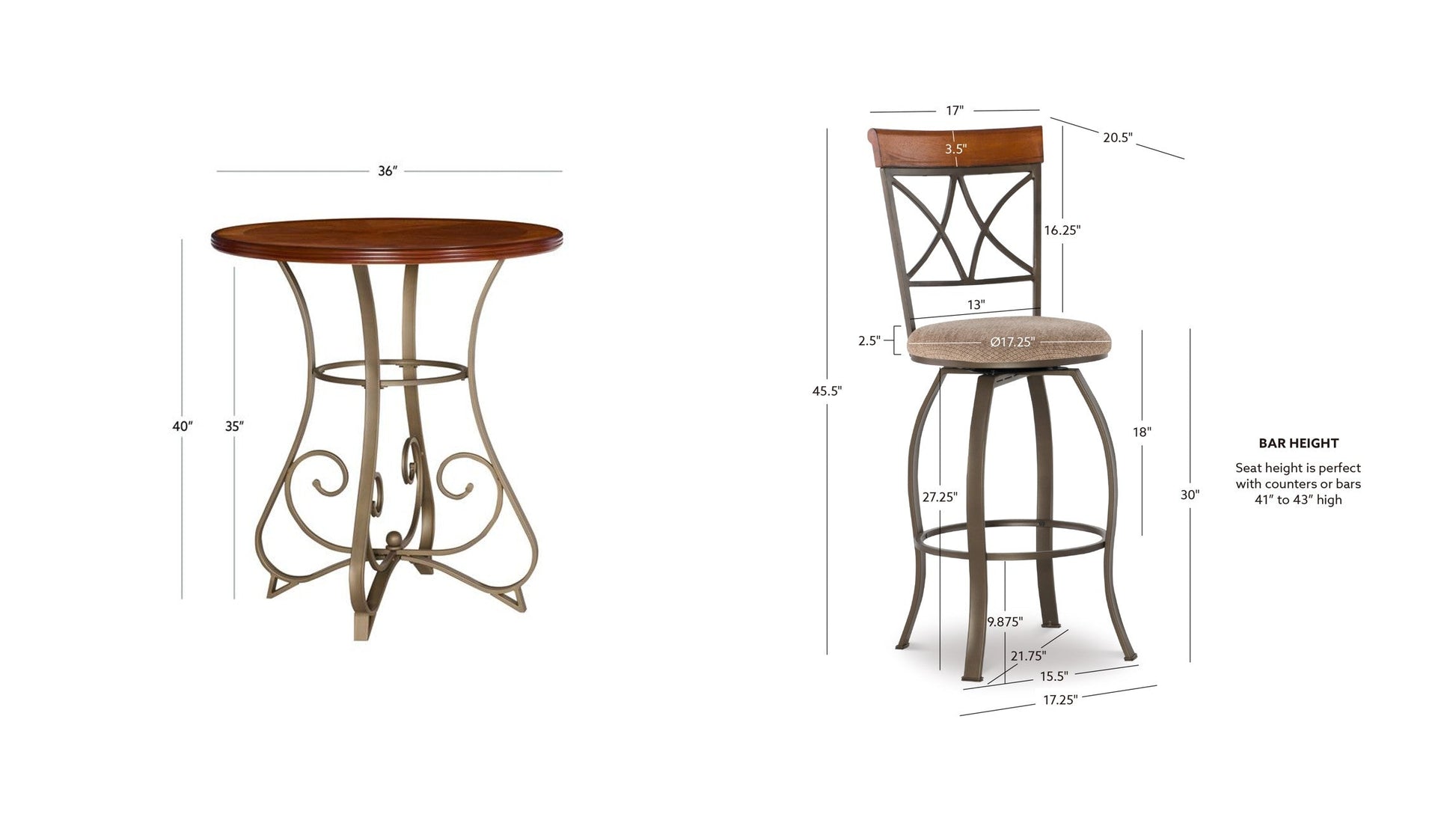 Cet ensemble de 3 pièces apportera une touche d'originalité à votre espace et offrira un bel espace de rangement. La table présente un plateau incurvé et orné de volutes. Les tabourets de bar pivotants sont dotés d'un dossier en forme de losange et de pieds légèrement incurvés. Finition en bois « faux cerisier moyen brossé » et structure en métal « étain et bronze mat ». Assemblage partiel requis.