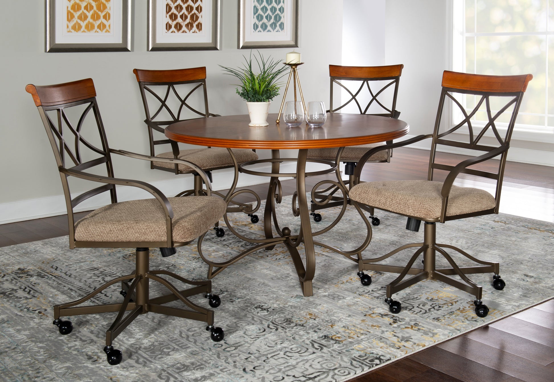 Cet ensemble de salle à manger 5 pièces de style transitionnel est idéal pour les réunions de famille ou entre amis. La table ronde présente un piètement orné de volutes et de courbes originales. Les chaises pivotantes et inclinables sont dotées d'un dossier en forme de losange, d'accoudoirs élégamment incurvés, d'une assise rembourrée en microfibre taupe/beige à motif losanges et de pieds à roulettes pour une mobilité aisée. La finition est en bois « faux cerisier moyen brossé » avec des éléments métalliques « étain mat et bronze ». Un assemblage est requis.