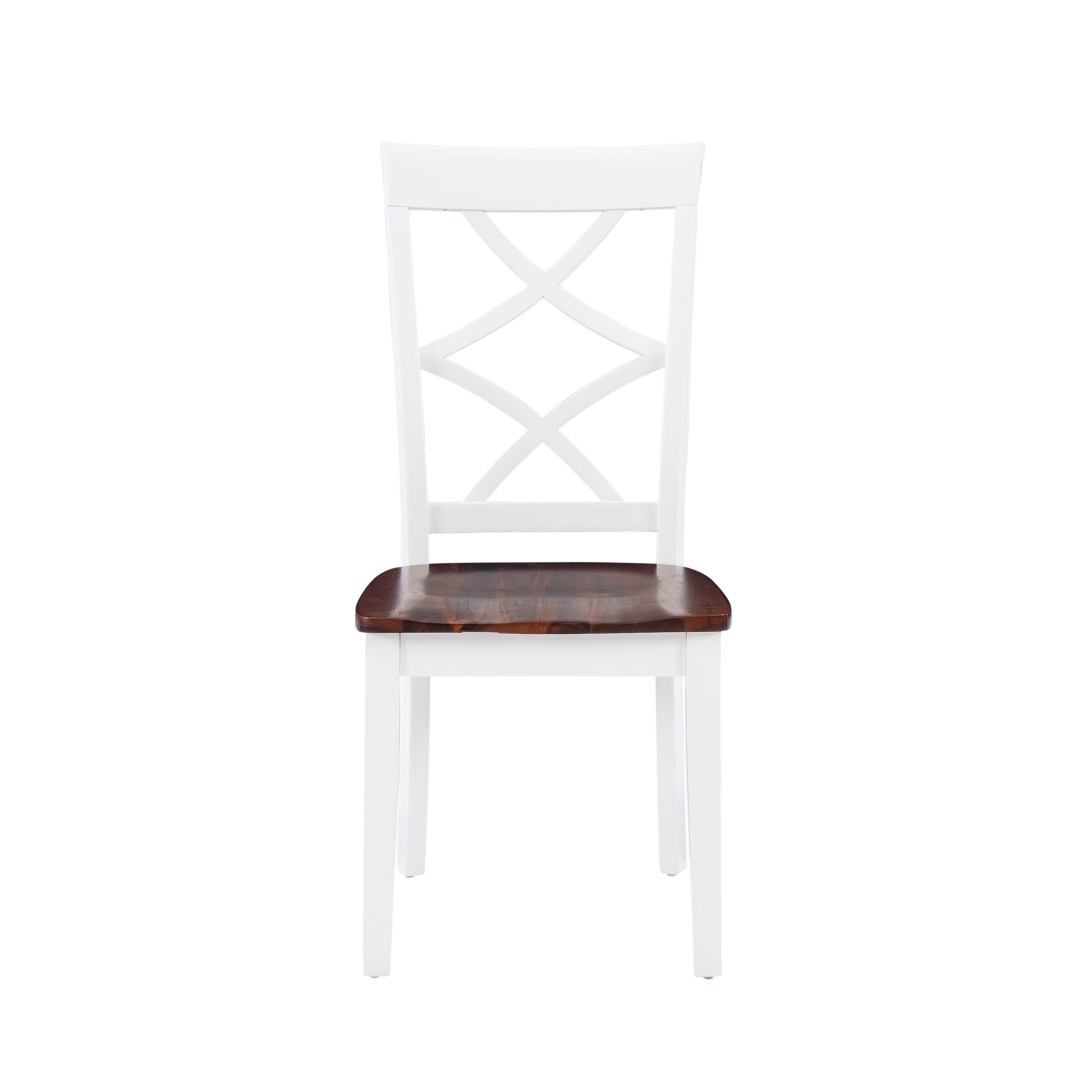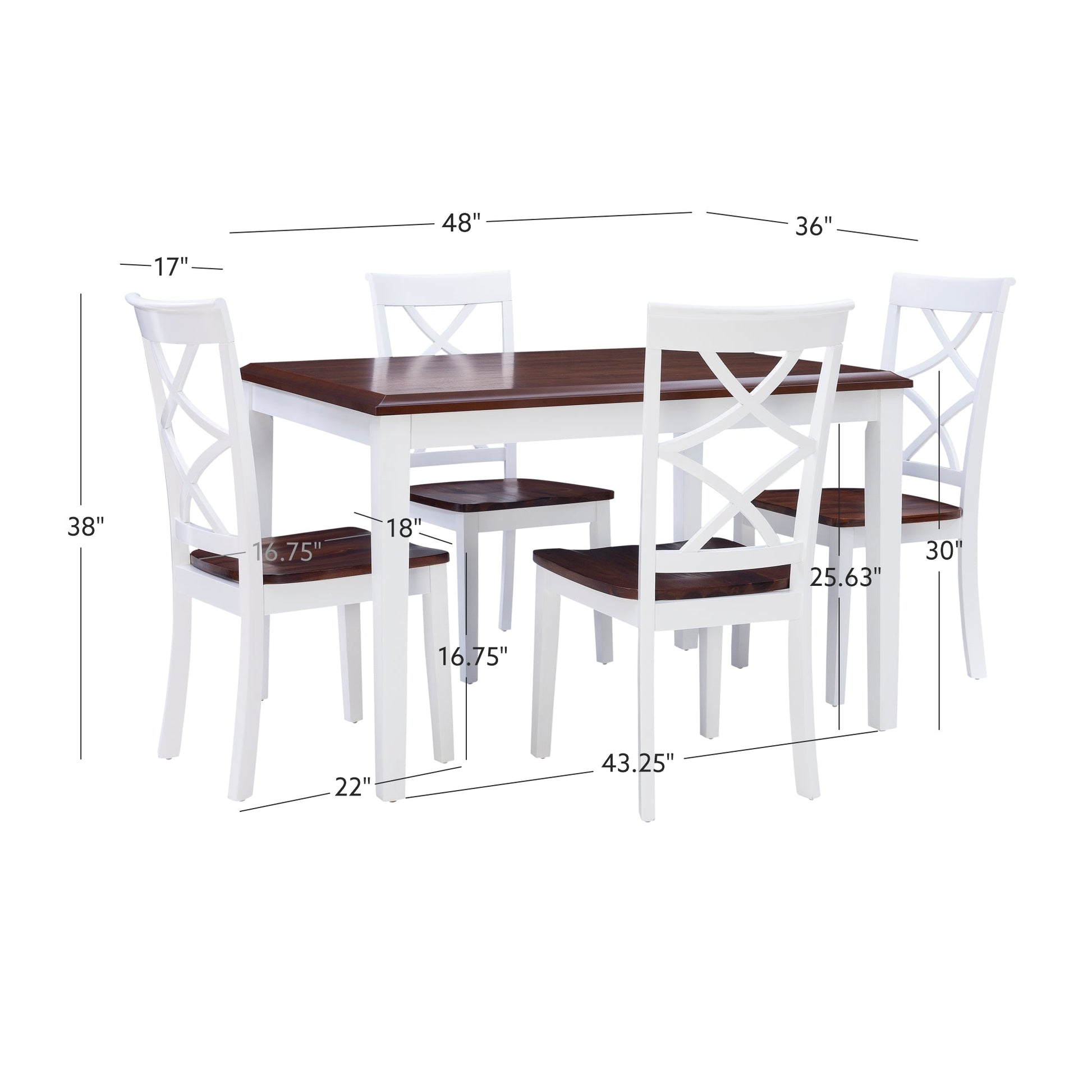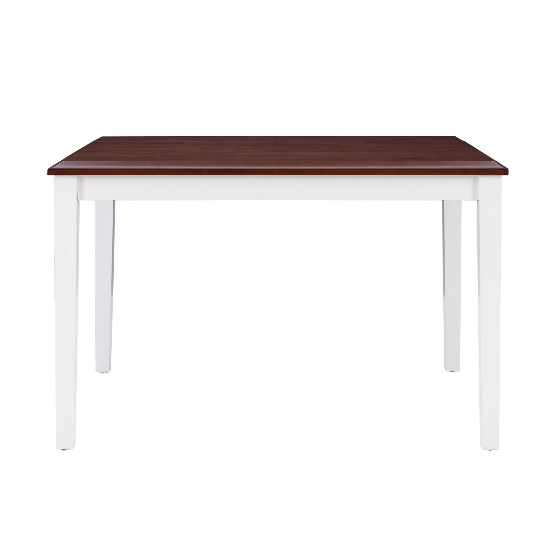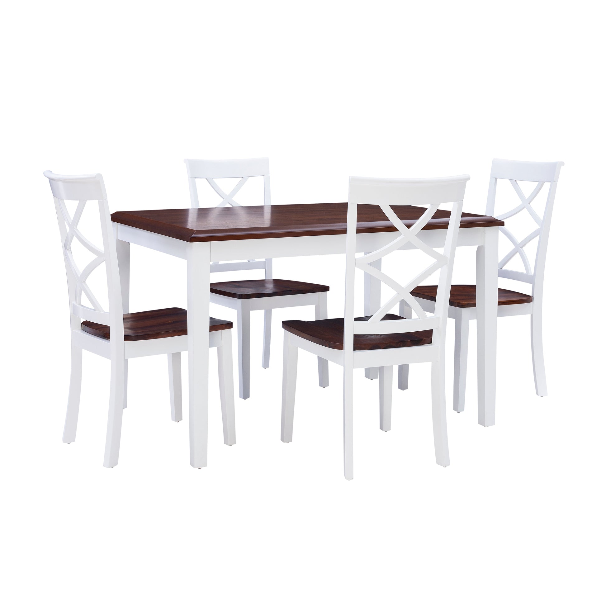 Cet ensemble de salle à manger chic, en merisier et blanc, comprend une table rectangulaire et quatre chaises. Fabriqué en MDF et placage en acacia, il présente un plateau et des assises de chaises couleur merisier, contrastant avec le dossier et les pieds blancs. Les chaises sont dotées d'un dossier à double croisillon pour une touche d'originalité. Assemblage requis.