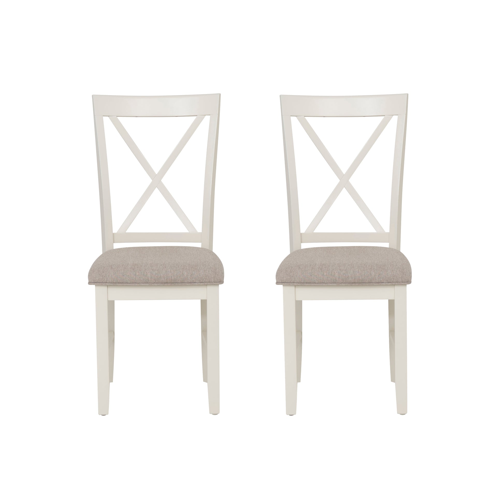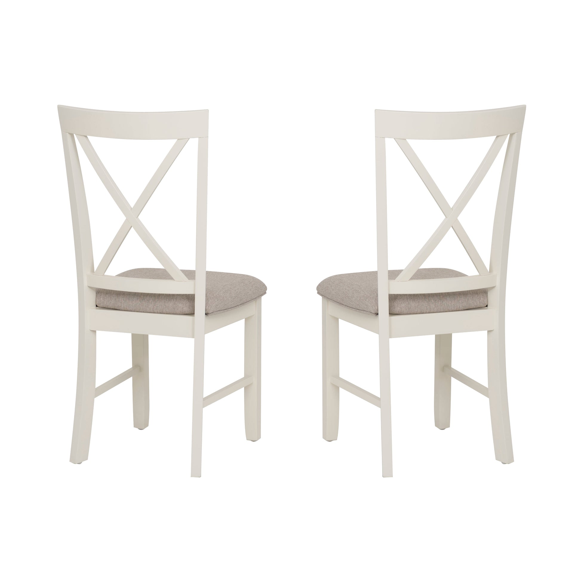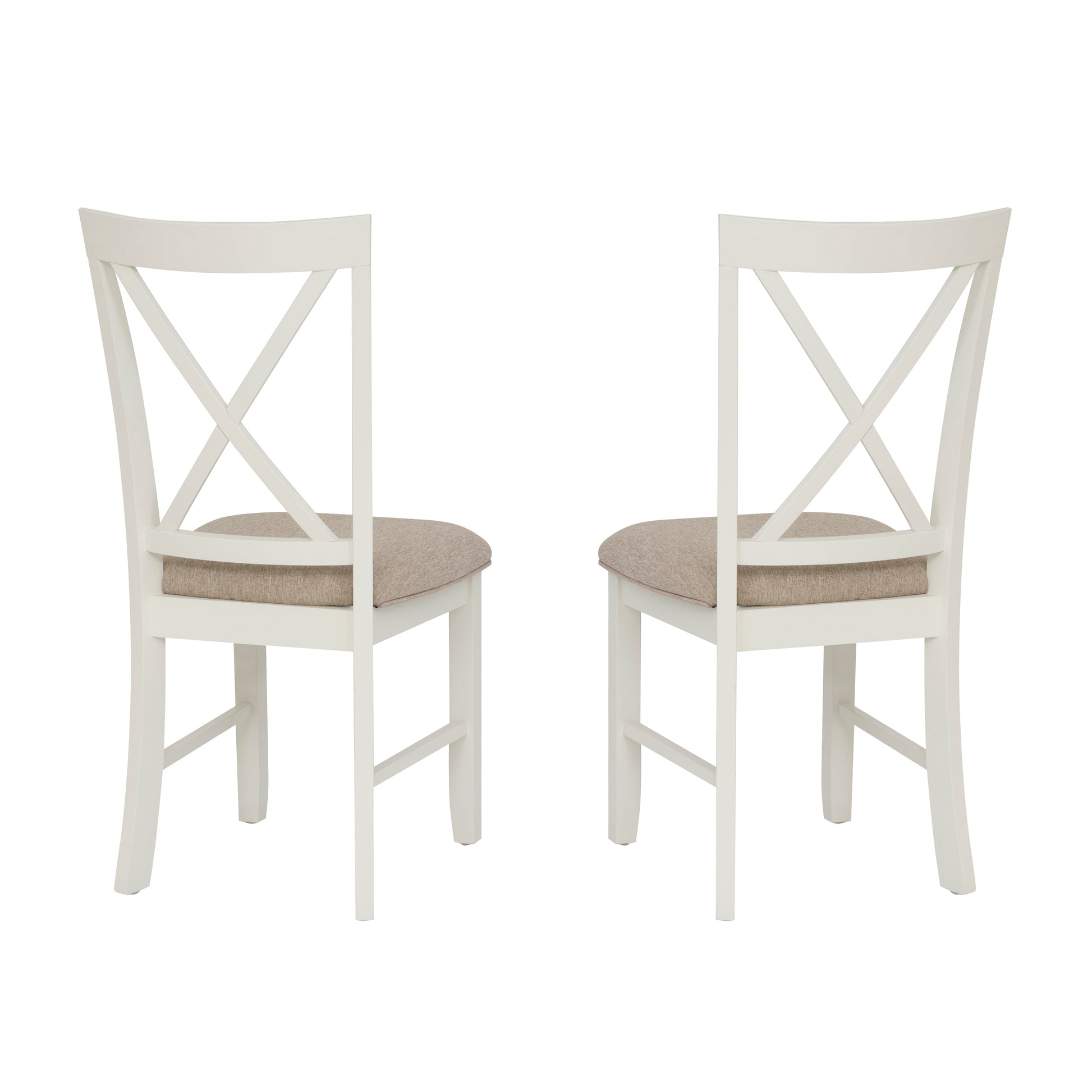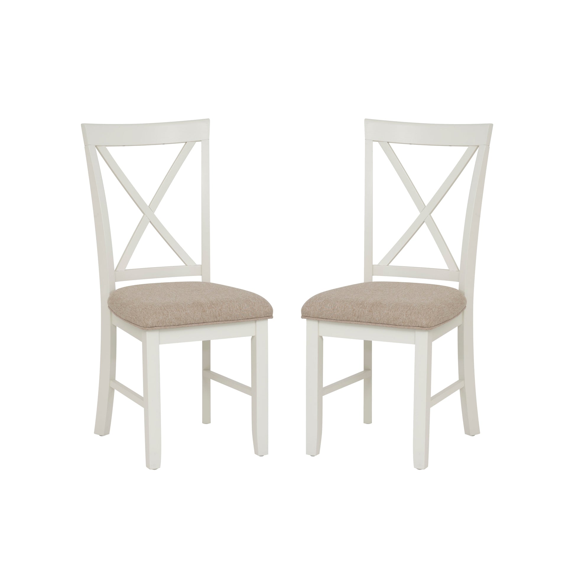 Ces chaises d'appoint s'intègrent parfaitement à tous les intérieurs, et pas seulement autour d'une table à manger. Leur dossier en X est doté d'un coussin en mousse confortable et leur style s'harmonise avec presque tous les décors. L'assise est revêtue d'un tissu beige clair uni, tissé en quadrillage pour un effet chiné. De plus, ce tissu haute performance est conçu pour résister aux taches, à l'humidité et aux odeurs. La structure de la chaise arbore une superbe finition laquée blanc vanille, en parfaite harmonie avec la table et le banc assortis. Un assemblage est requis. L'entretien est facile : un simple nettoyage localisé avec un chiffon humide ou sec suffit. Vendues séparément. Deux chaises par carton.