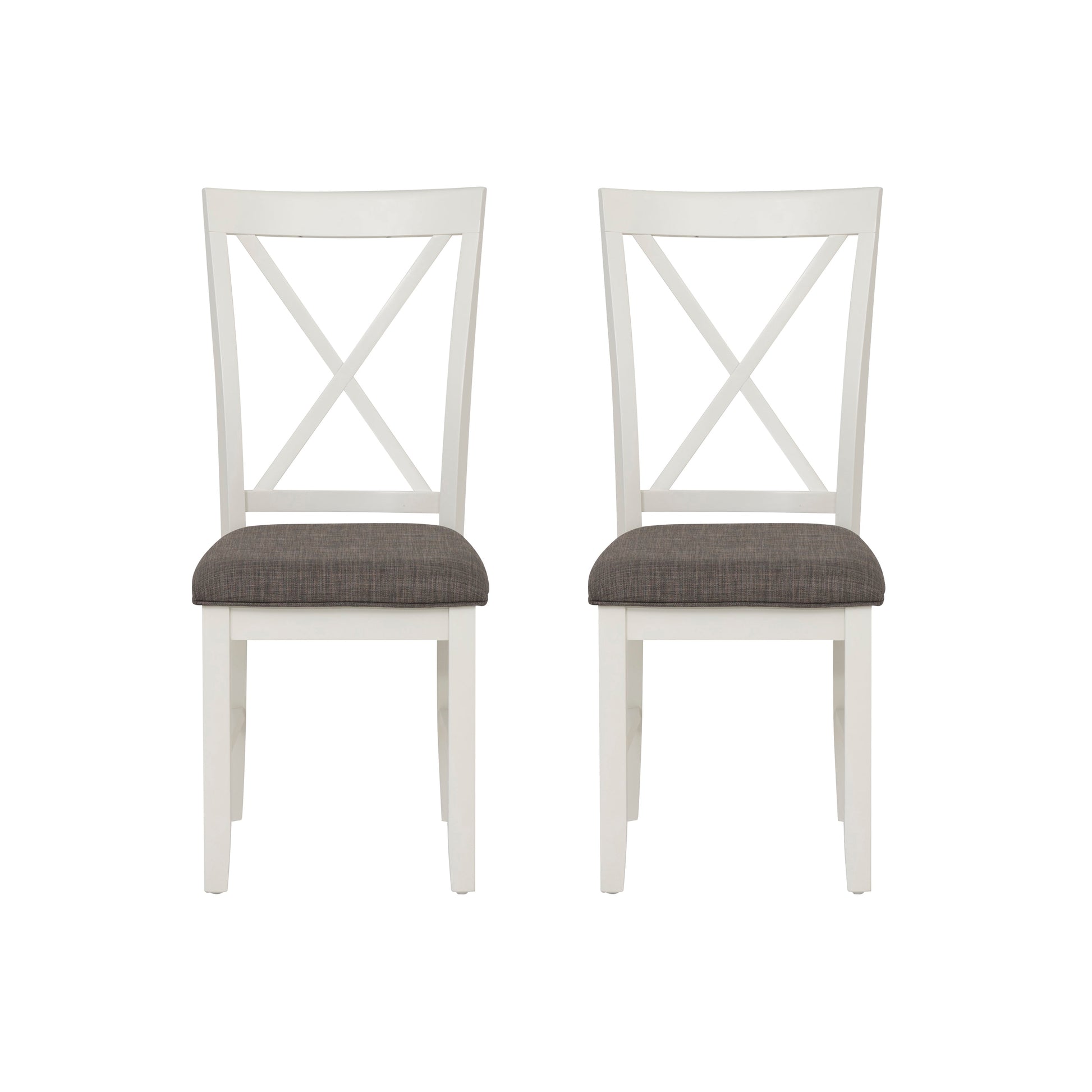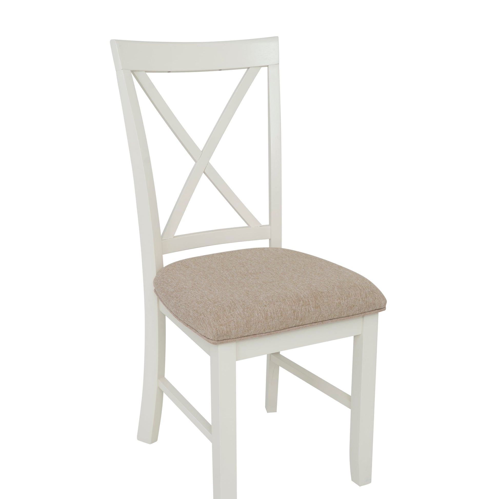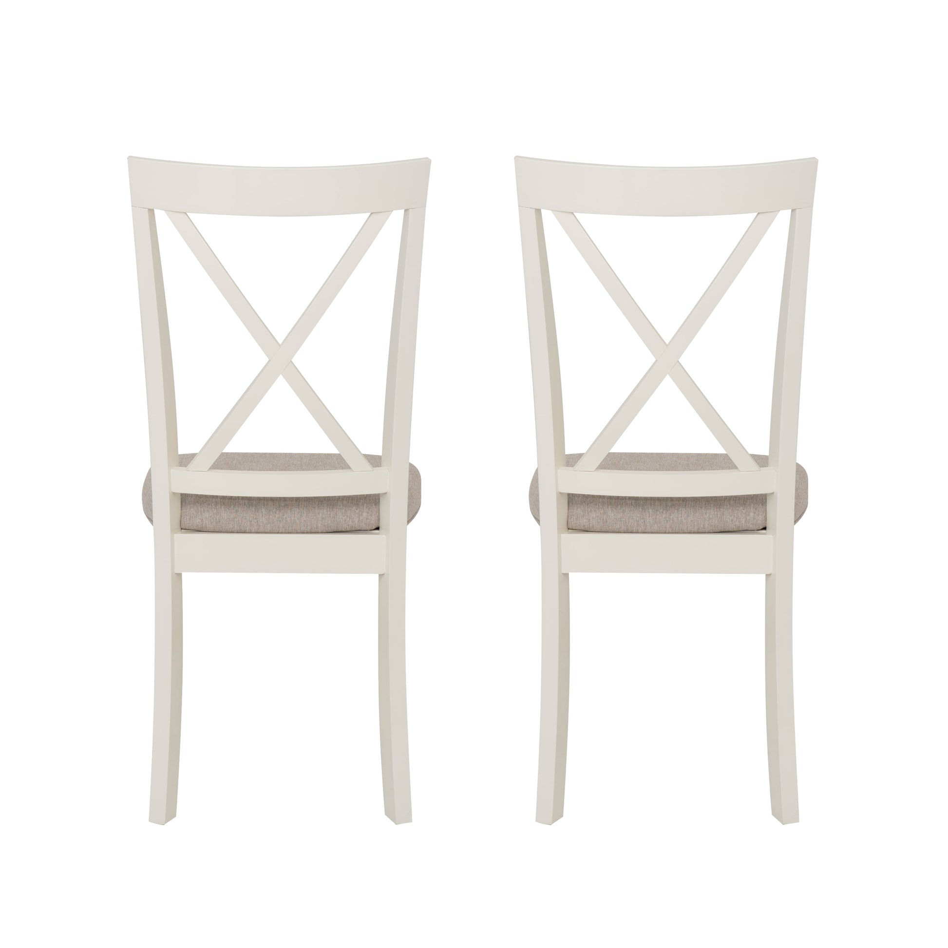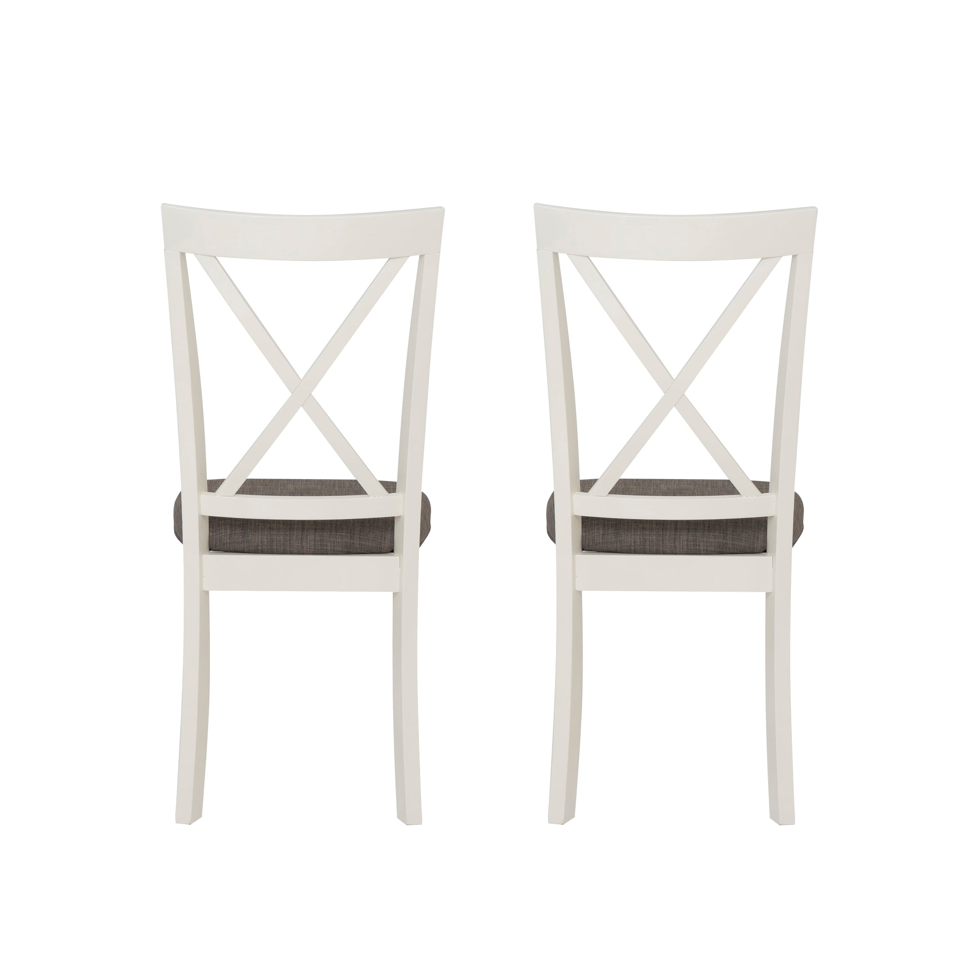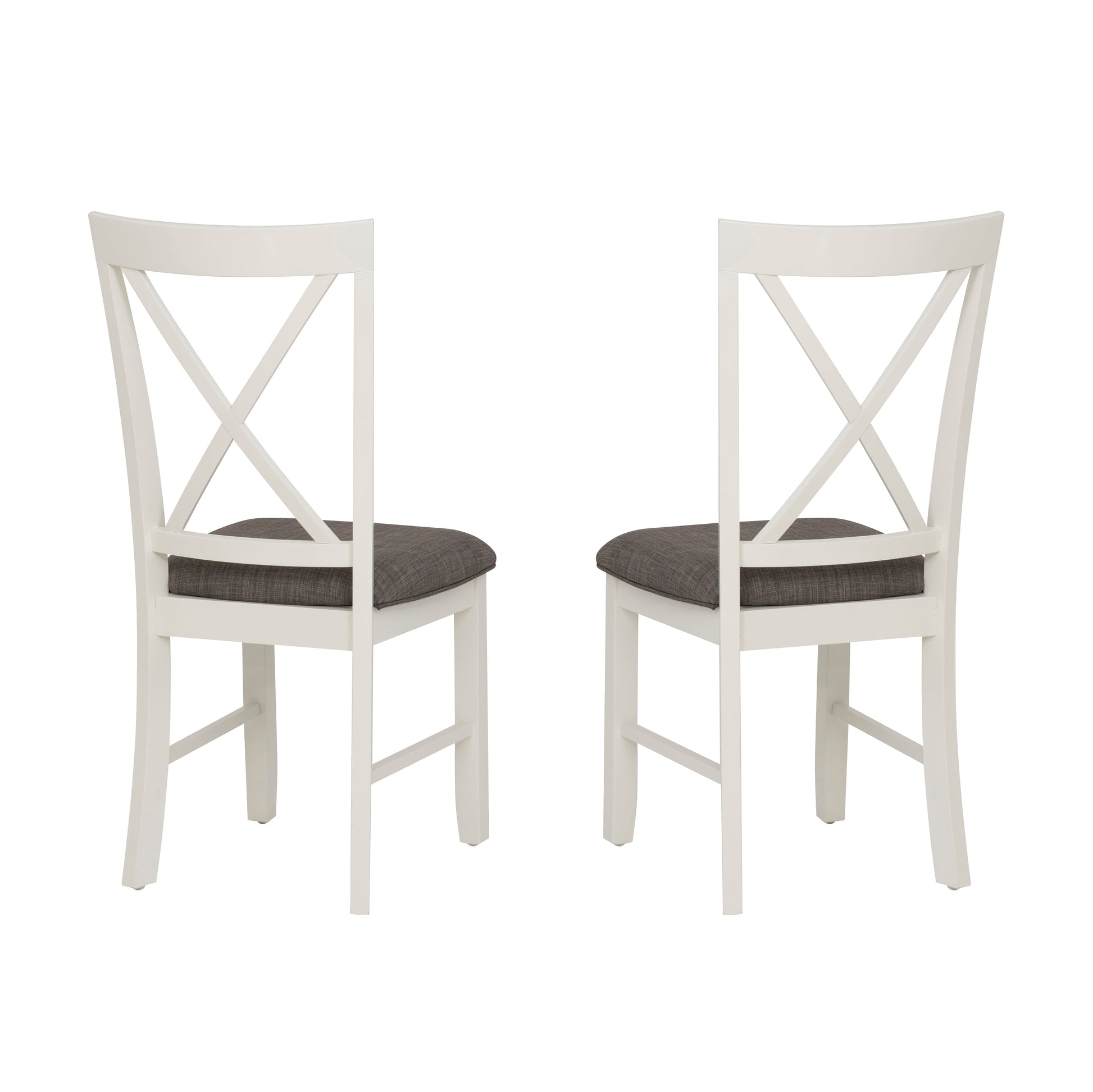 Ces chaises d'appoint s'intègrent parfaitement à tous les intérieurs, et pas seulement autour d'une table à manger. Leur dossier en X est doté d'un coussin en mousse confortable et leur style s'harmonise avec presque tous les décors. L'assise est revêtue d'un tissu beige clair uni, tissé en quadrillage pour un effet chiné. De plus, ce tissu haute performance est conçu pour résister aux taches, à l'humidité et aux odeurs. La structure de la chaise arbore une superbe finition laquée blanc vanille, en parfaite harmonie avec la table et le banc assortis. Un assemblage est requis. L'entretien est facile : un simple nettoyage localisé avec un chiffon humide ou sec suffit. Vendues séparément. Deux chaises par carton.