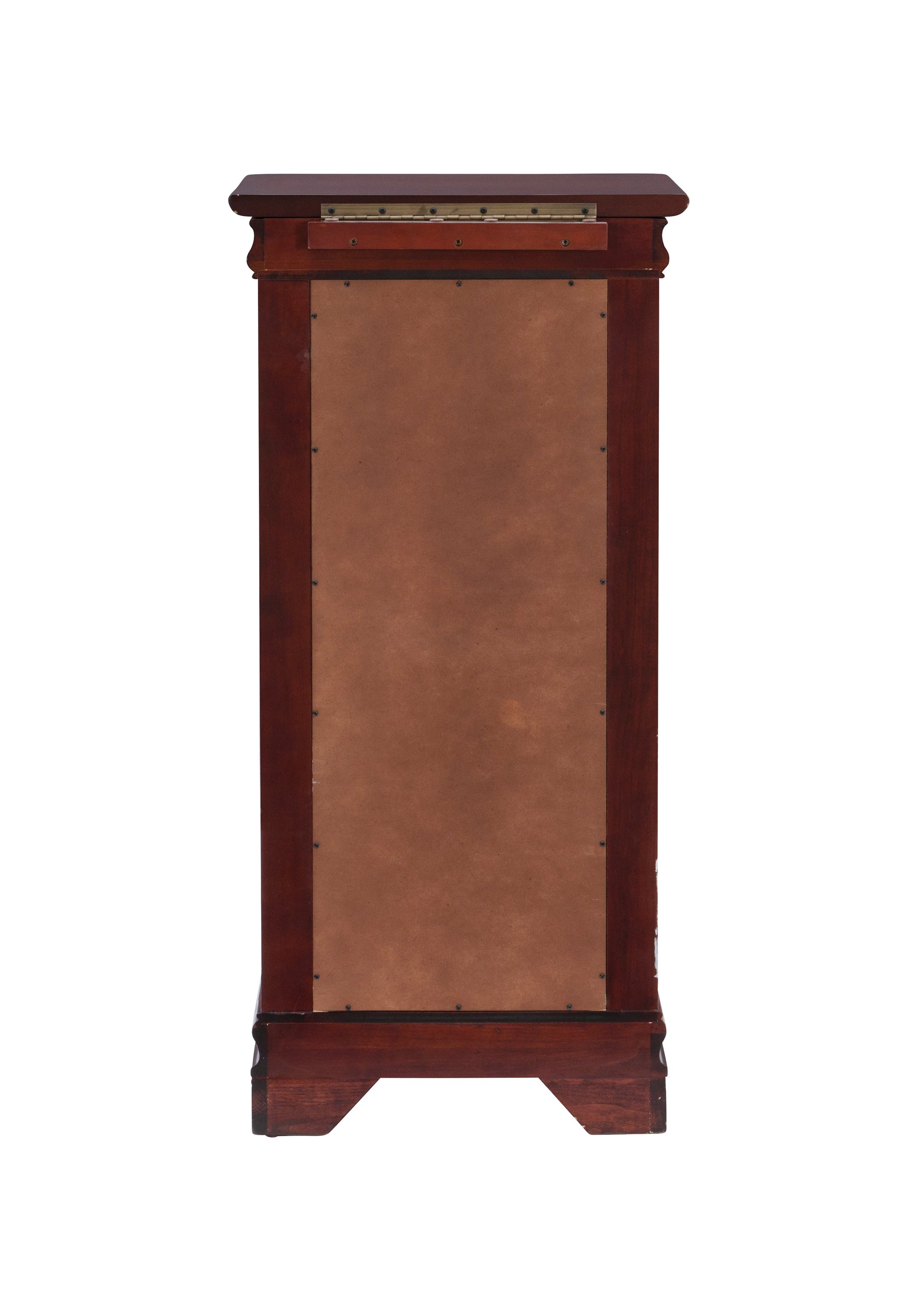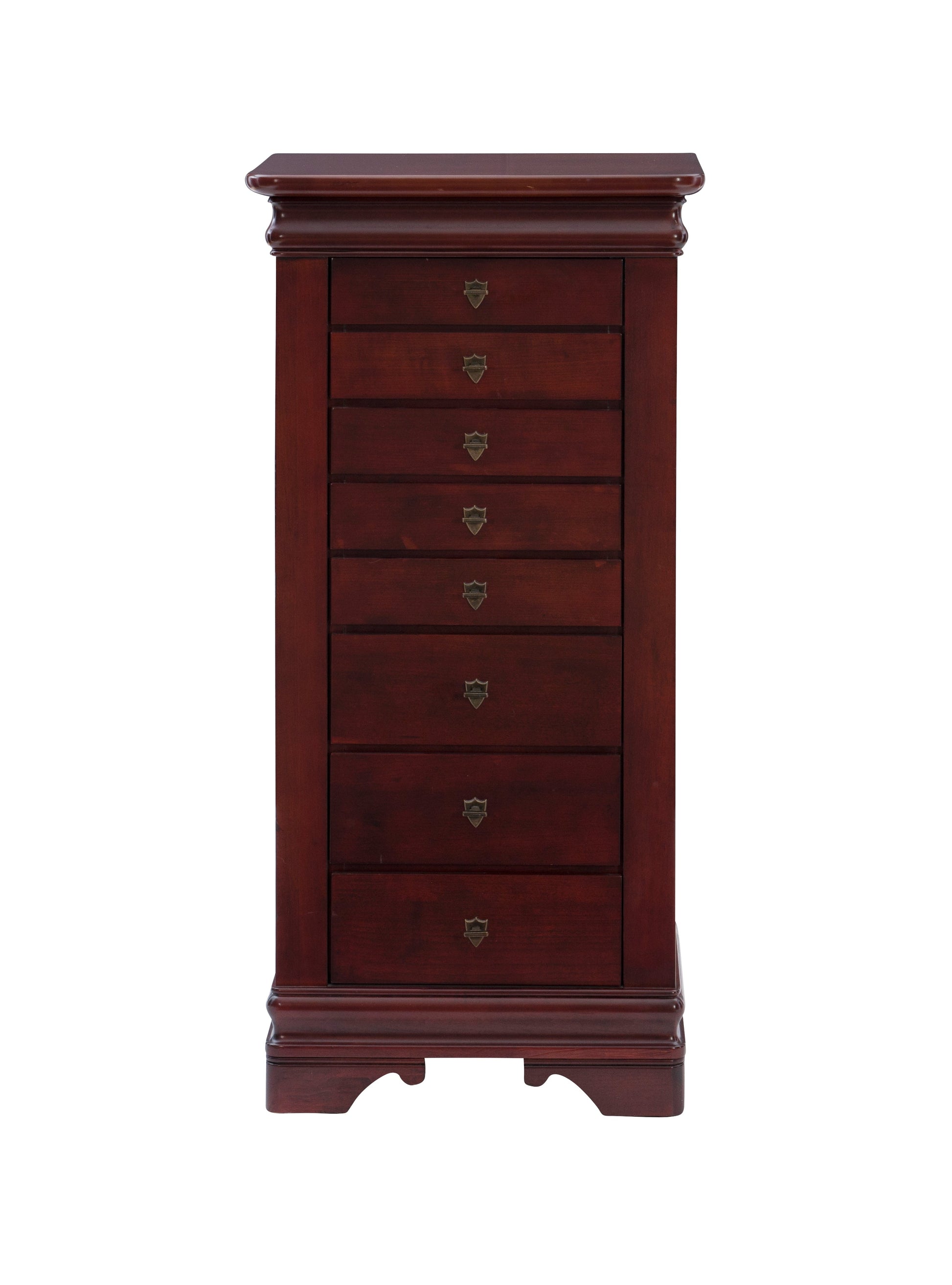 Élégante et intemporelle, cette armoire à bijoux autoportante, finition cerisier Marquis, allie raffinement traditionnel et fonctionnalité au quotidien. Ornée de détails Louis-Philippe classiques et de ferrures en laiton vieilli en forme de blason, elle sublimera toute chambre. Son couvercle rabattable s'ouvre sur un compartiment à bijoux compartimenté et doté d'un miroir, tandis que ses portes latérales à ouverture tactile dévoilent des crochets pour colliers. Huit tiroirs spacieux, doublés d'un tissu noir moelleux, offrent un rangement sûr et élégant pour vos bagues, bracelets, boucles d'oreilles et autres souvenirs. Magnifiquement conçue et soignée dans les moindres détails, cette armoire allie beauté et praticité pour vos trésors les plus précieux.