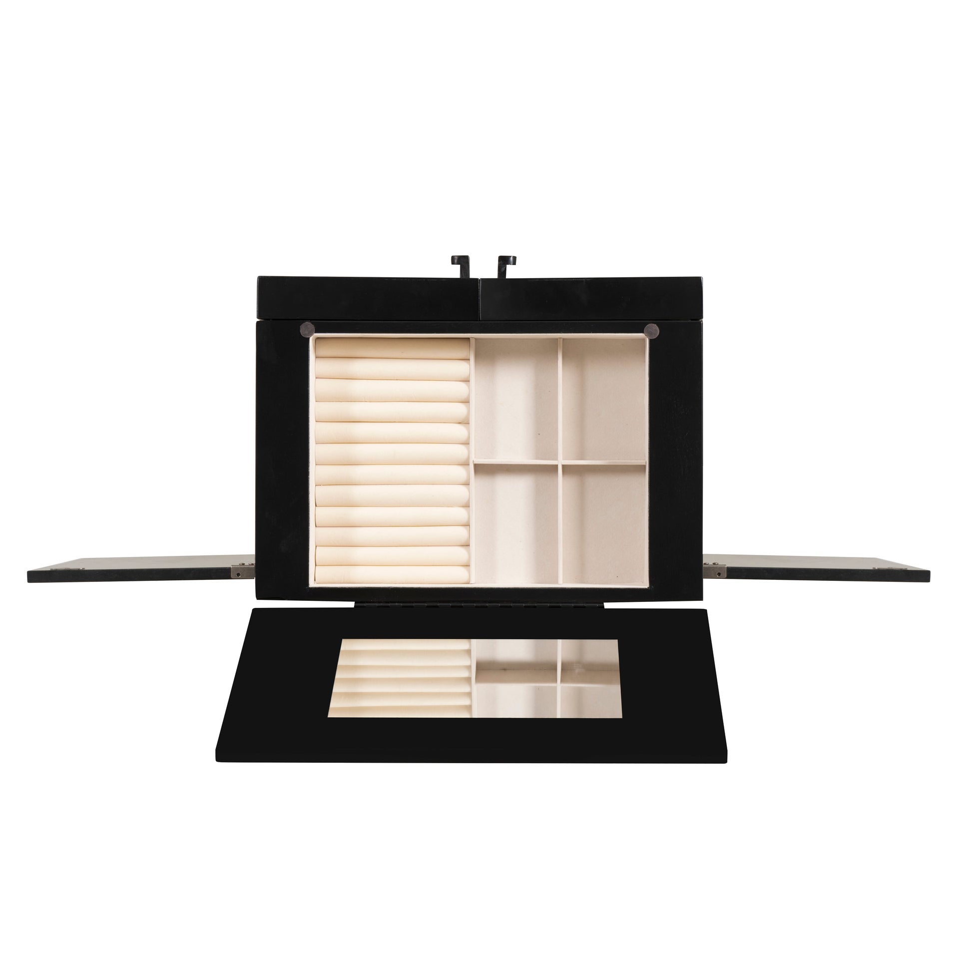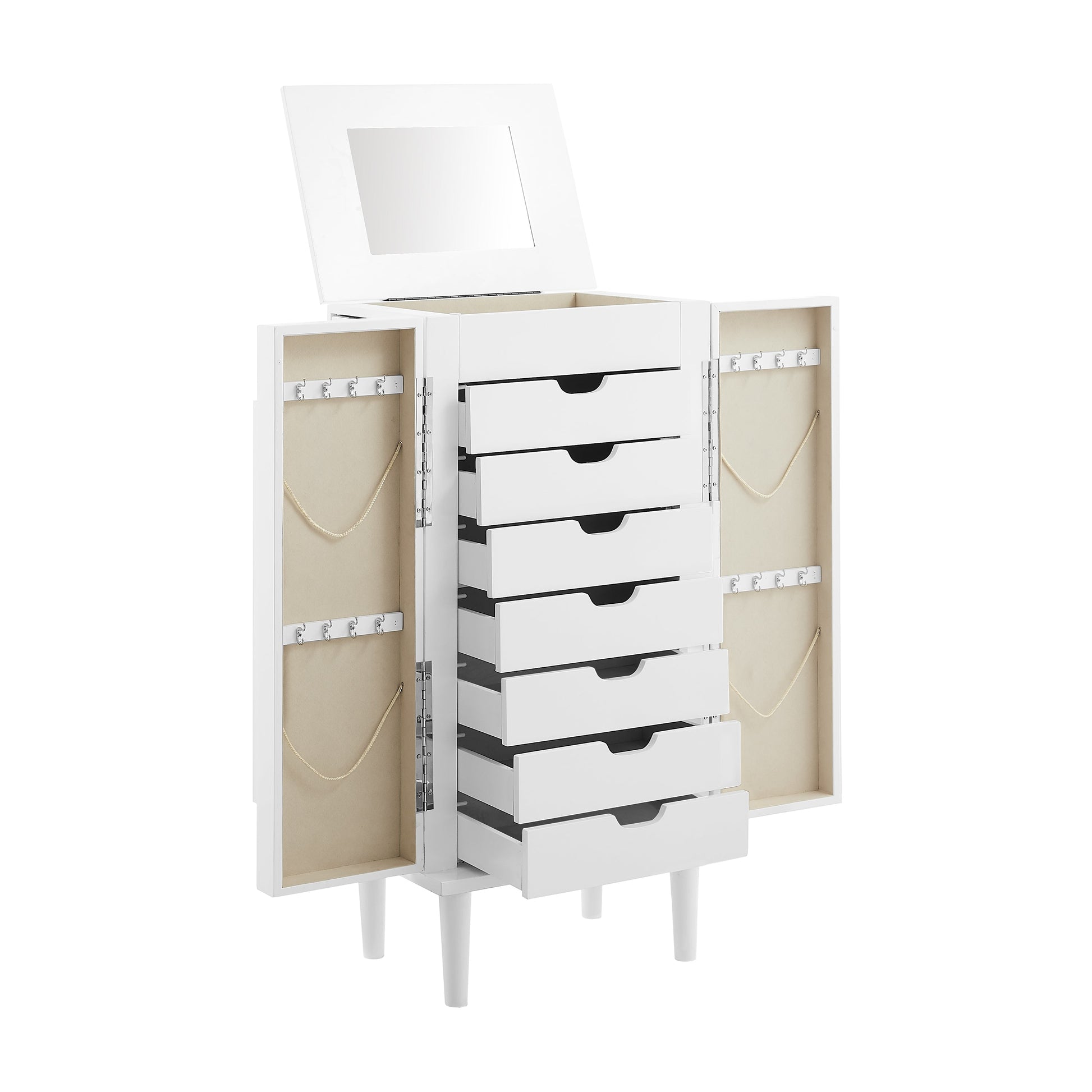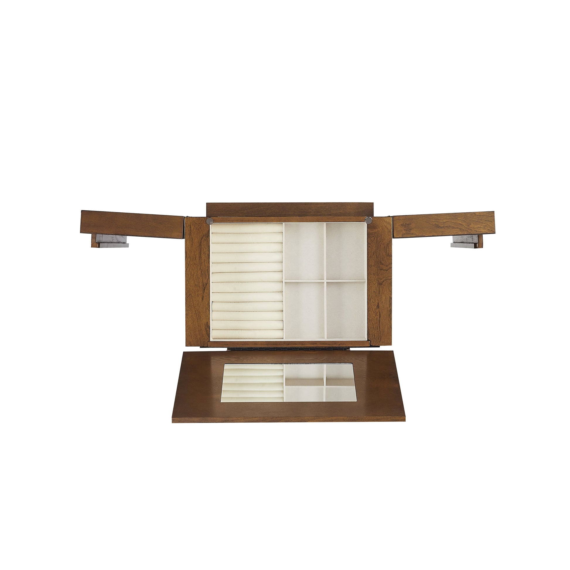 Sublimez le rangement de vos bijoux avec cette magnifique armoire, conçue pour allier élégance, polyvalence et organisation. Disponible en plusieurs finitions pour s'harmoniser avec votre décoration, cette armoire est dotée d'un miroir rabattable, de portes latérales battantes avec de nombreux crochets pour colliers et bracelets, et de tiroirs spacieux doublés de feutre doux pour protéger vos précieux bijoux. Ingénieusement conçue avec des compartiments dissimulés et des détails modernes, elle offre un équilibre parfait entre esthétique et fonctionnalité, ce qui en fait un élément indispensable de toute chambre ou dressing.