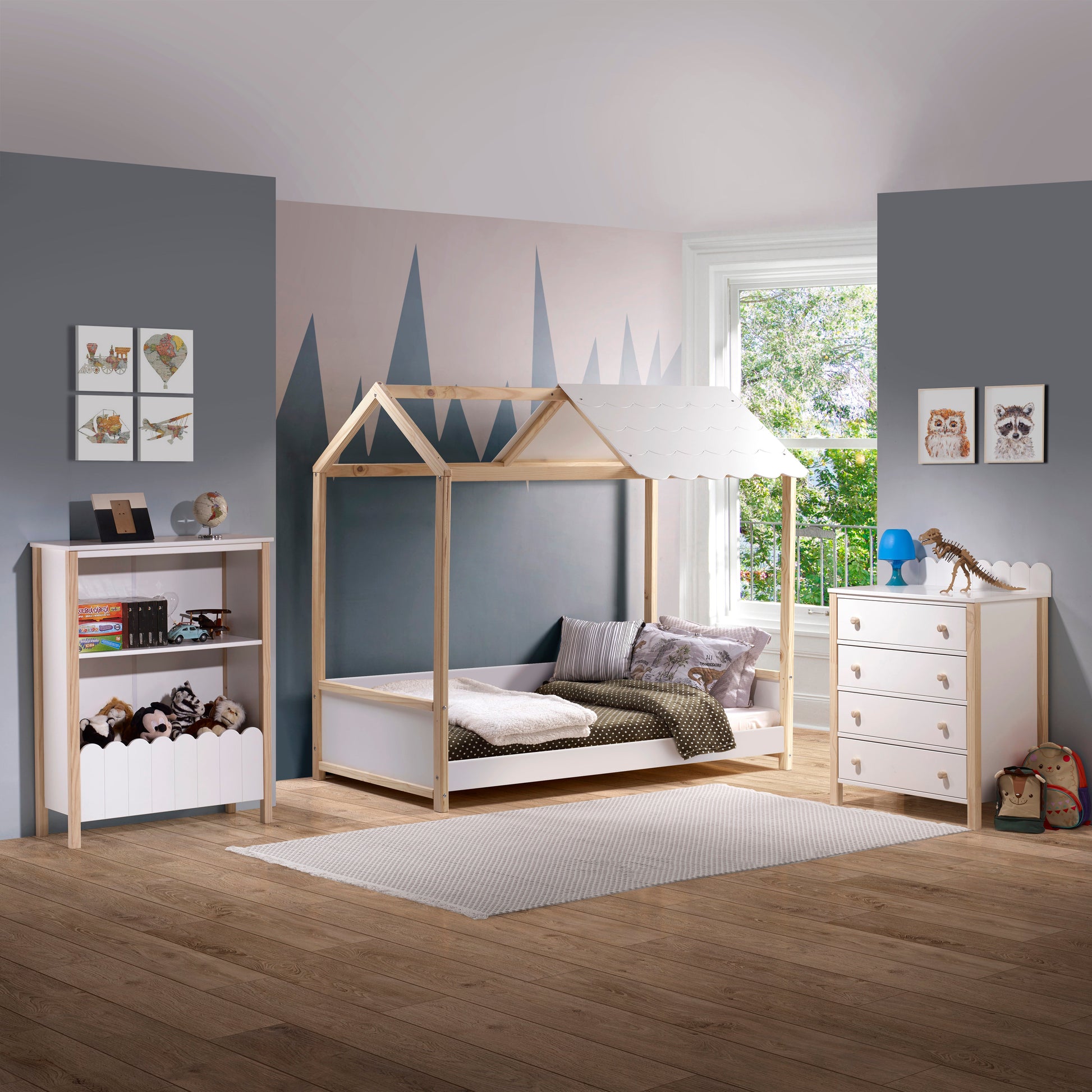 Transformez l'heure du coucher en un moment magique avec ce charmant cadre de lit simple. Son design fantaisiste le rend idéal aussi bien pour jouer que pour faire de beaux rêves. Personnalisez son apparence avec un toit complet, un demi-toit ou sans toit du tout : laissez libre cours à l'imagination de votre enfant ! Une finition blanche éclatante associée à des accents de pin naturel s'intègre harmonieusement dans tout intérieur moderne. Fabriqué en bois massif et MDF, avec des lattes robustes en pin qui dispensent d'un sommier tapissier, ce lit est à la fois élégant et pratique. Quatre pieds robustes en pin offrent une base sûre et confortable pour des nuits paisibles.