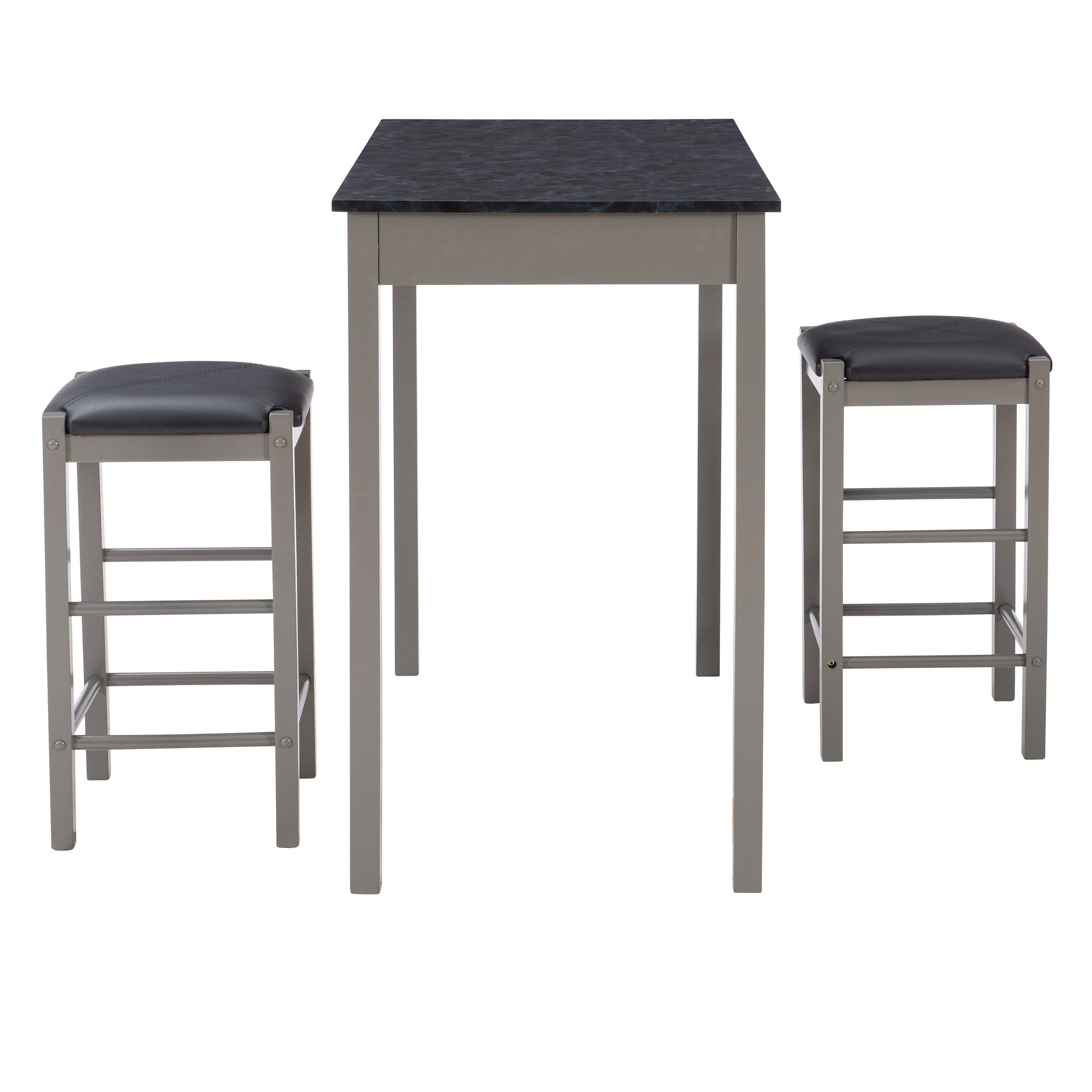 Ensemble de comptoir 3 pièces offrant un gain de place optimal. Cet ensemble comprend une élégante table rectangulaire reposant sur de longs pieds robustes, ainsi que deux tabourets de bar sans dossier, dotés d'assises rembourrées en similicuir noir. Fabriqué en bois massif avec un plateau imitation marbre, cet ensemble arbore une finition noire qui lui confère une allure élégante et raffinée. Les tabourets se rangent facilement sous la table lorsqu'ils ne sont pas utilisés. Idéal pour la cuisine, la salle à manger, le salon ou tout autre espace de réception.
