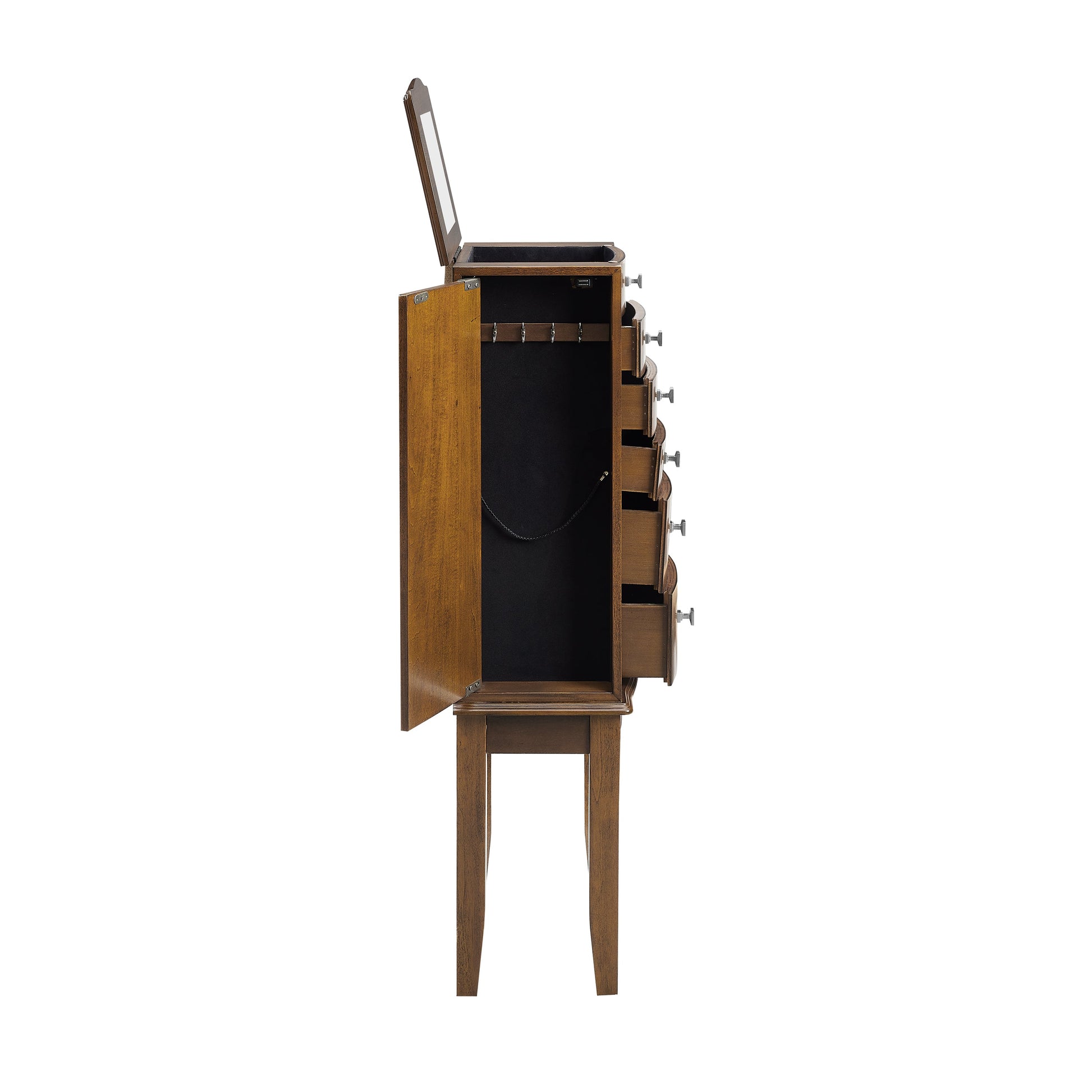 Intemporelle et pratique, cette armoire à bijoux allie l'élégance traditionnelle à la fonctionnalité moderne. Sa finition noyer chaleureuse et ses ferrures métalliques confèrent un cachet classique à votre intérieur, tandis que son agencement intérieur soigné permet de ranger et de protéger vos bijoux. Le couvercle rabattable révèle un miroir et un compartiment compartimenté, tandis que les panneaux latéraux s'ouvrent pour dévoiler des crochets pour colliers et bracelets. Plusieurs tiroirs doublés de feutre offrent à la fois protection et présentation raffinée, garantissant ainsi que vos précieux bijoux restent démêlés et parfaitement rangés.
