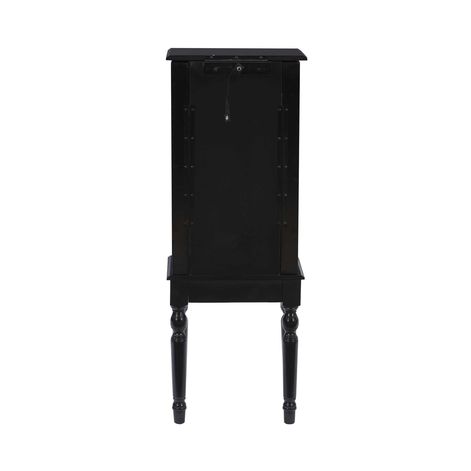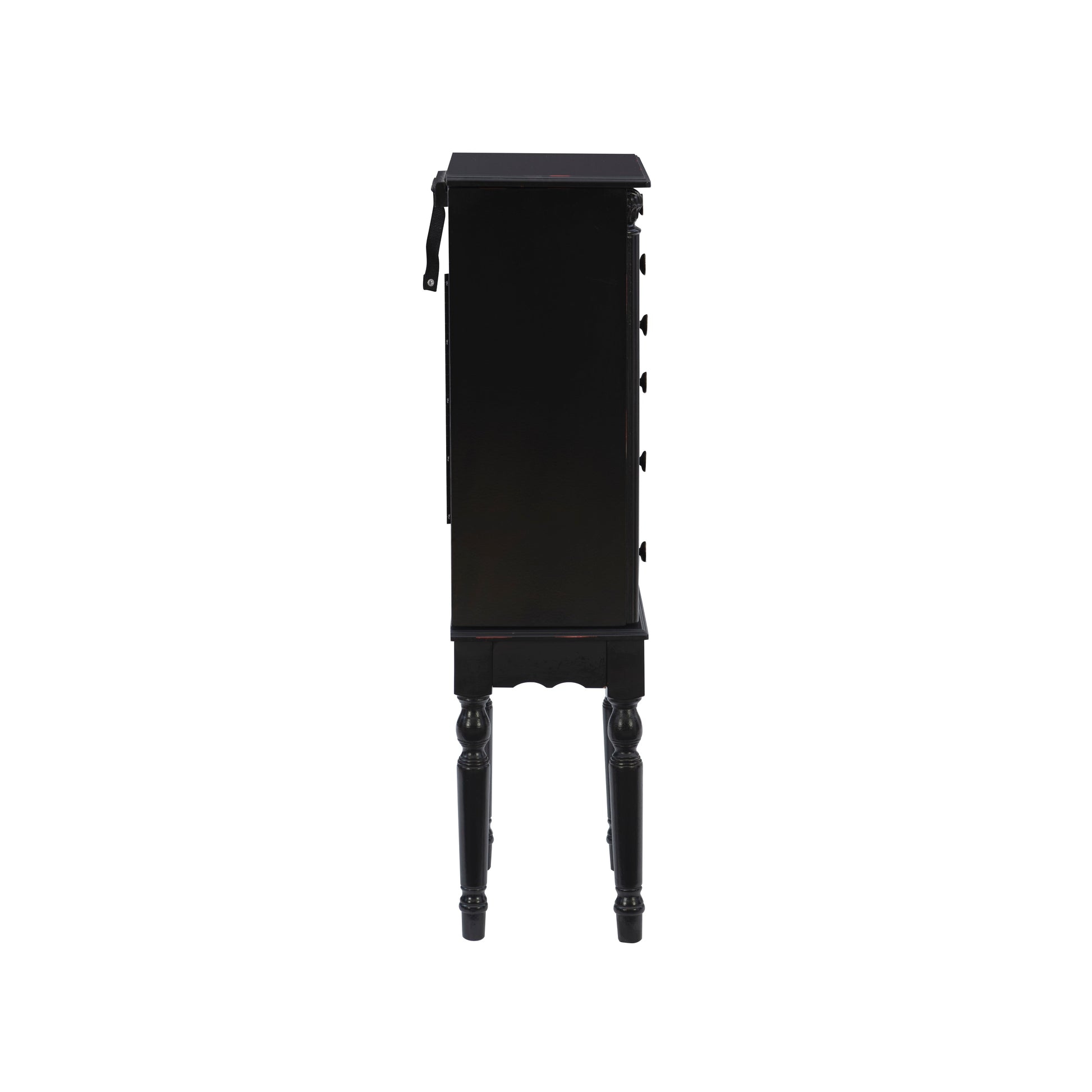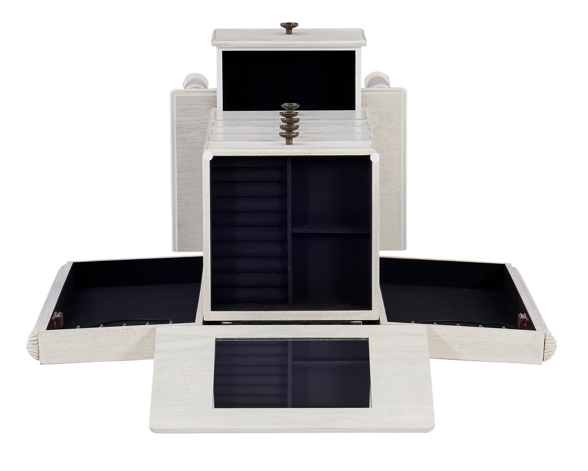 Conçue avec élégance et praticité, cette petite armoire à bijoux offre un style intemporel et un rangement astucieux. Disponible en noir ébène, cerisier profond ou blanc crème, elle est dotée d'un couvercle à charnière avec miroir intégré, d'une jupe festonnée et de pieds classiques tournés. Le compartiment supérieur est intelligemment compartimenté avec des supports pour bagues et deux sections carrées pour organiser vos petits bijoux. Les portes latérales s'ouvrent sur un intérieur entièrement doublé, équipé de crochets pour colliers et de cordons en rayonne assortis pour éviter que les chaînes ne s'emmêlent. En dessous, trois petits tiroirs et deux grands offrent un rangement polyvalent : l'un avec six compartiments, un autre avec quatre, et le dernier entièrement doublé pour les pièces plus volumineuses. Chaque tiroir et compartiment est doublé de rayonne 100 % pour protéger vos bijoux avec une élégance discrète.