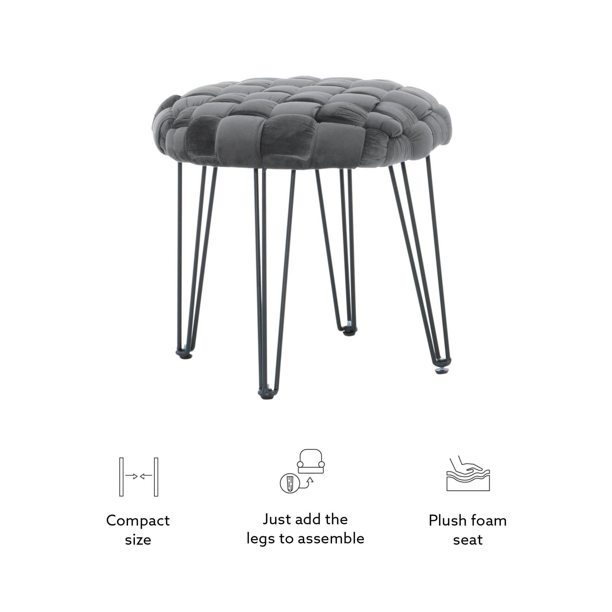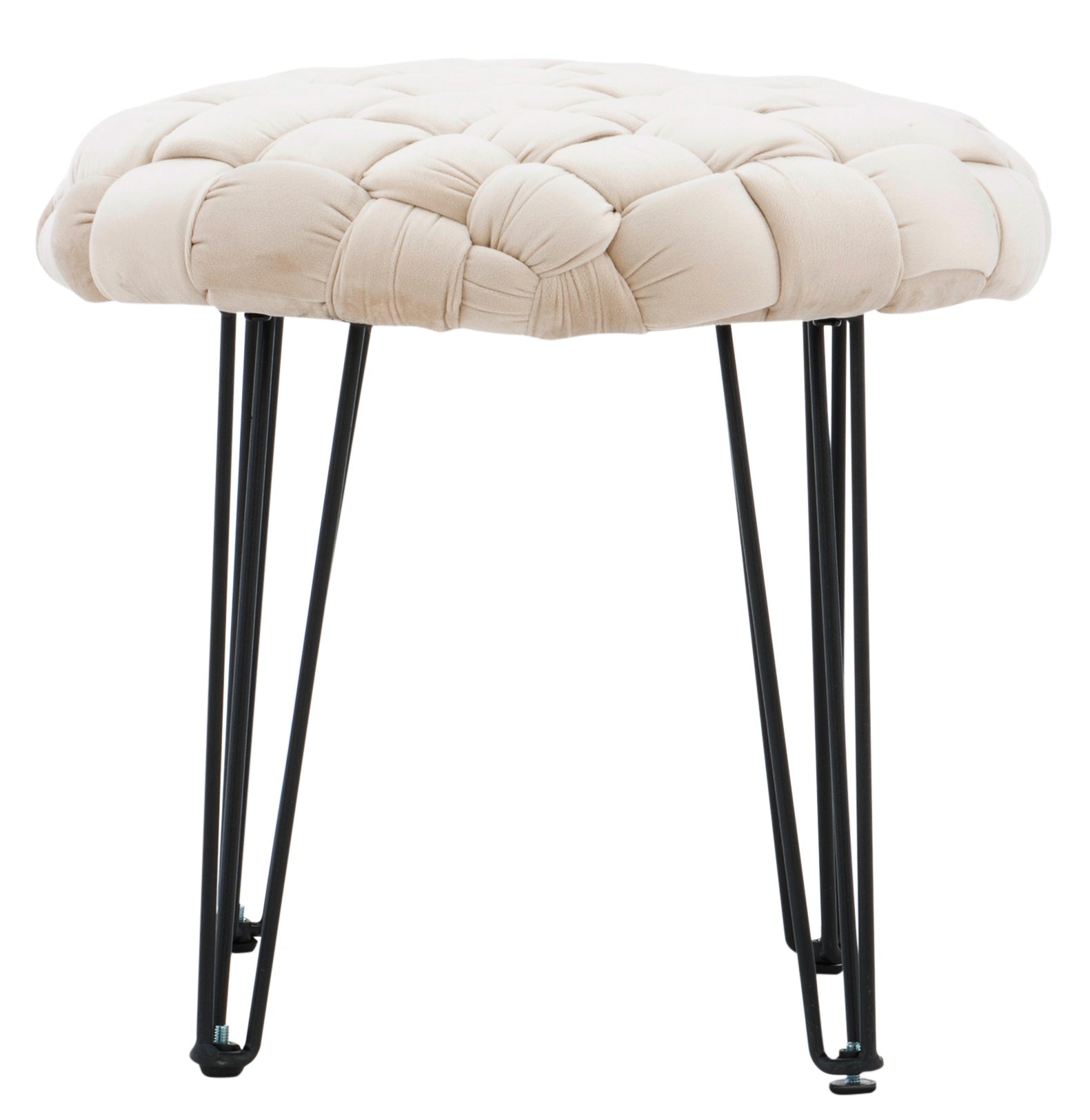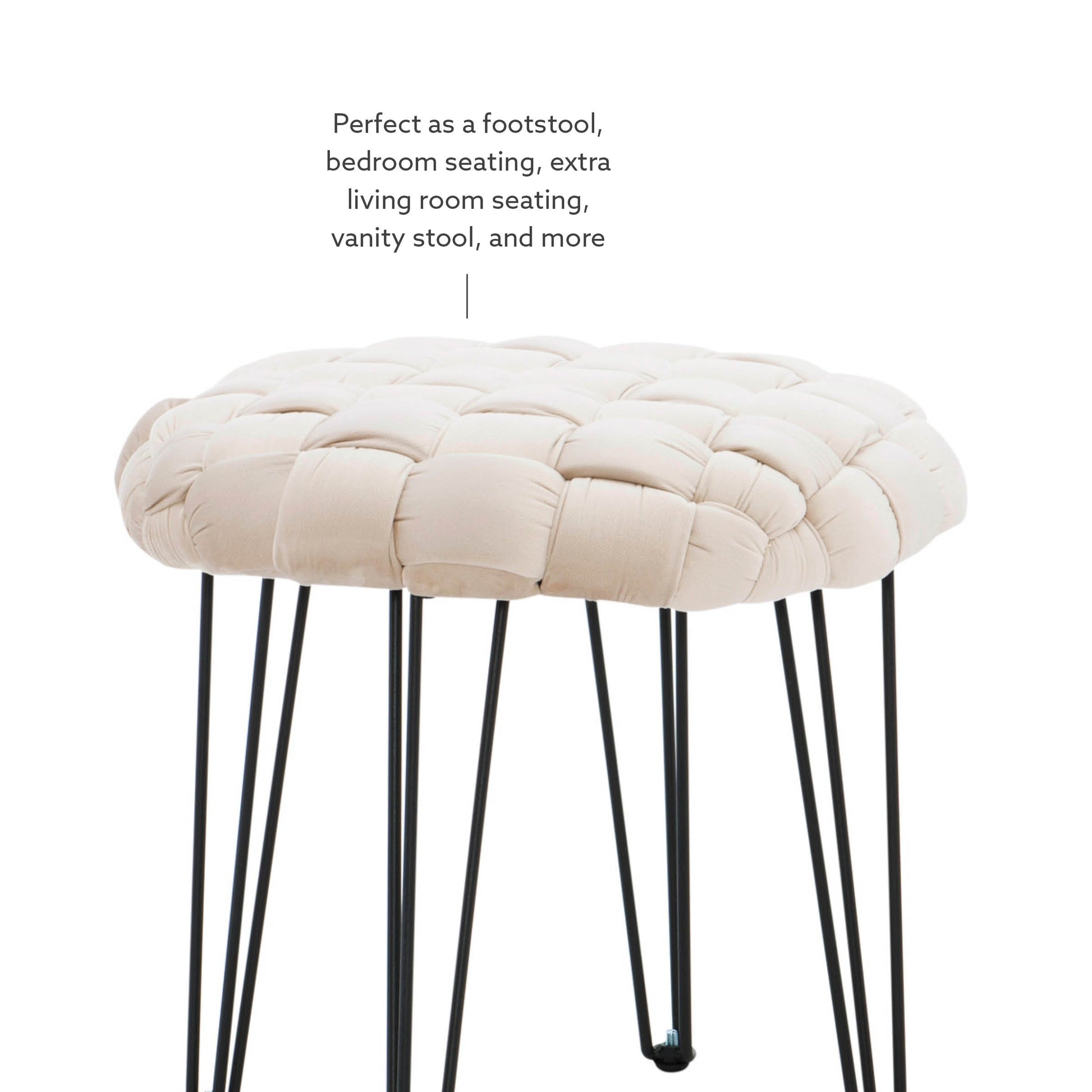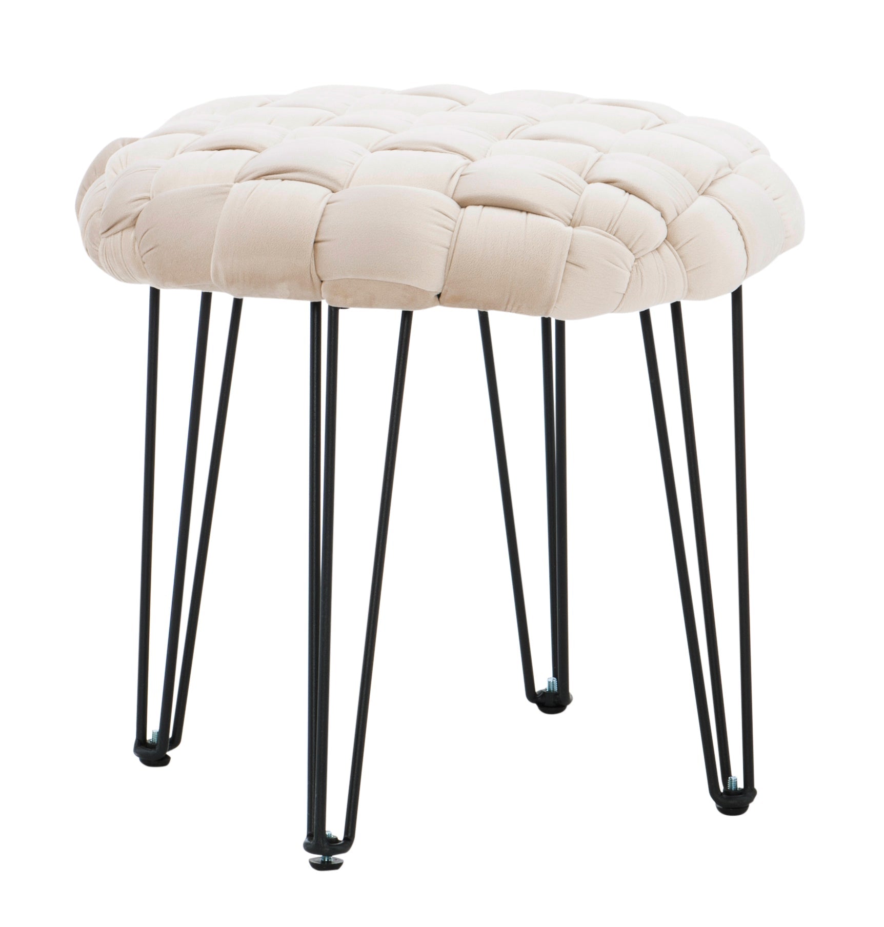 Ce pouf rond est un meuble d'appoint polyvalent qui s'intègre à merveille dans bien des intérieurs. Son assise en velours crème tressé à la main, 100 % polyester, offre un confort optimal grâce à son rembourrage en mousse qui s'harmonise avec tous les styles de décoration. Placez-le à côté de votre canapé comme repose-pieds, dans une chambre ou un bureau comme siège d'appoint, devant un miroir comme tabouret de coiffeuse, ou partout où vous aimez vous détendre. Ses pieds en métal noir, de type épingle à cheveux, sont réglables pour une stabilité parfaite sur les tapis et les sols irréguliers. Flexibilité, confort et style réunis.
