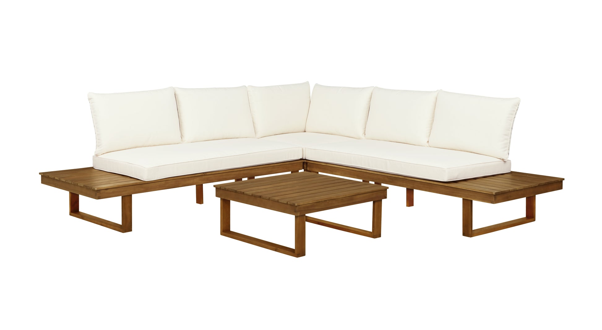 - Tables basses à lattes : La table basse assortie offre une surface spacieuse pour poser vos boissons, grignoter ou lire au soleil. Des tablettes latérales intégrées à chaque causeuse offrent également un espace supplémentaire là où vous en avez besoin.