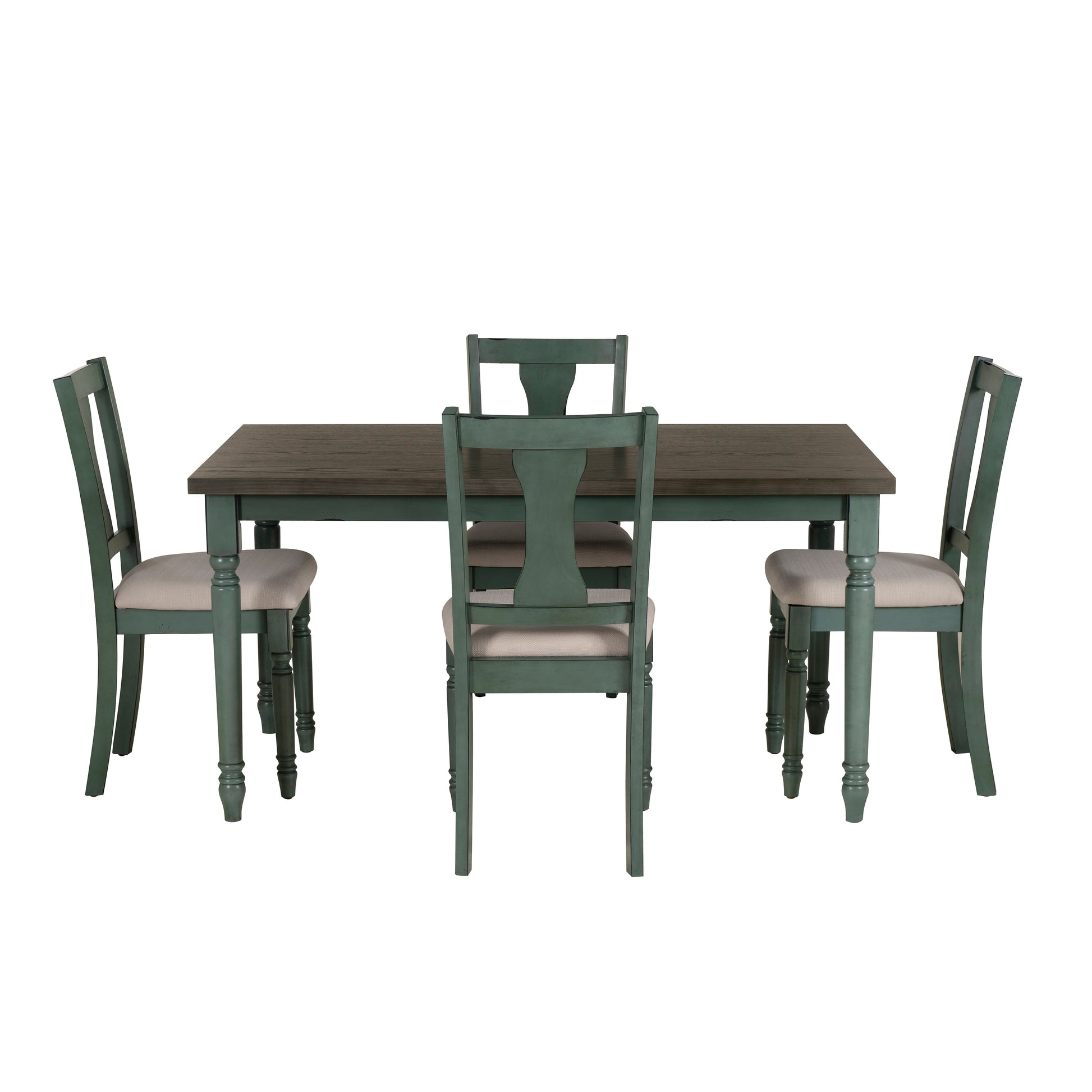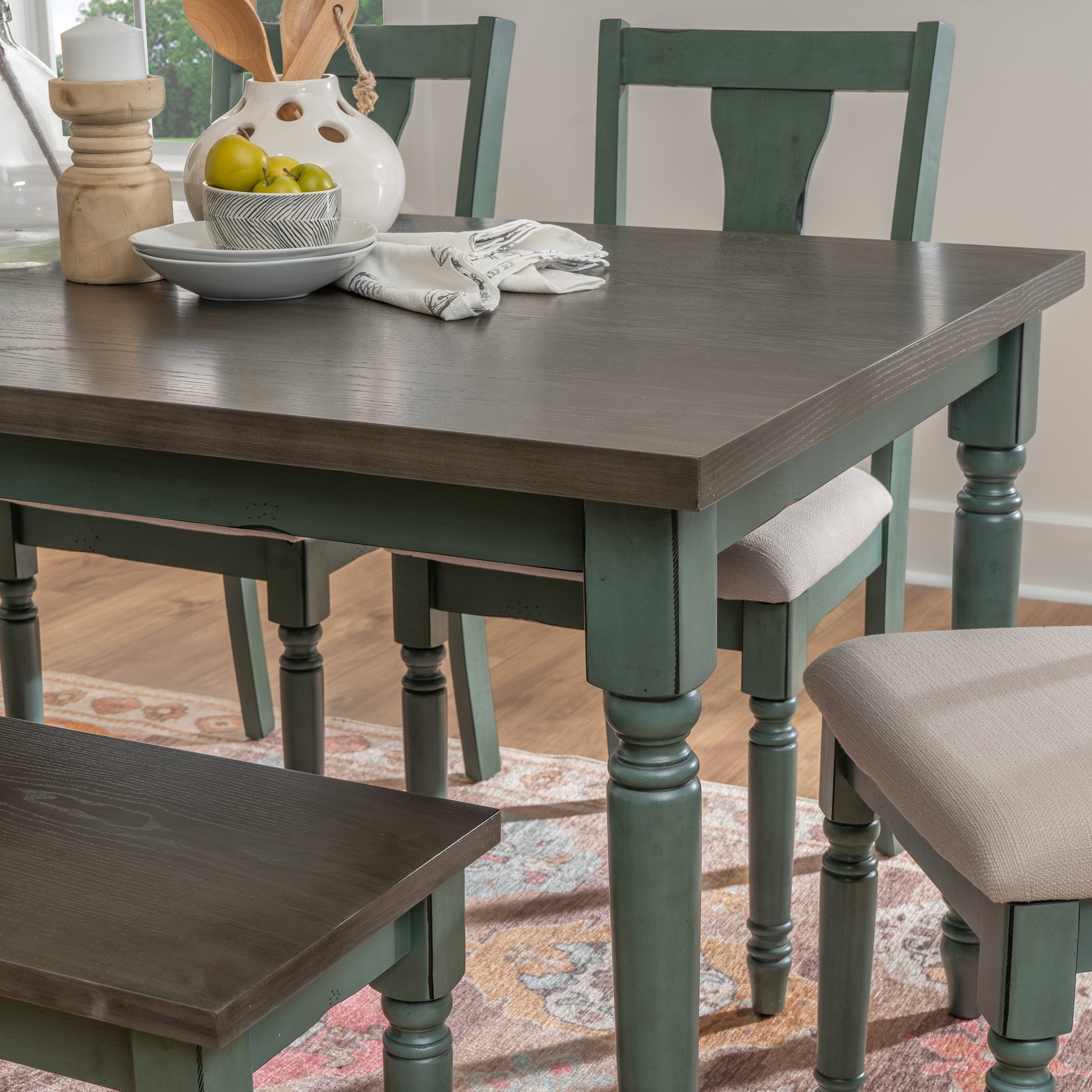Réunissez-vous avec style grâce à ce magnifique ensemble de salle à manger rustique, conçu pour apporter chaleur et caractère à chaque repas. Choisissez entre un ensemble 5 pièces comprenant une table et quatre chaises, ou un ensemble 6 pièces avec un banc deux places supplémentaire. Le plateau de table patiné offre un contraste saisissant avec le piètement bleu turquoise profond, alliant le charme rustique à une élégance d'inspiration vintage. Les pieds tournés robustes lui confèrent un charme intemporel, tandis que le banc assorti offre une grande polyvalence et des places assises supplémentaires pour la famille et les invités. Les chaises et le banc (en option) complètent l'ensemble, chacun étant doté d'une assise rembourrée et revêtue d'un tissu doux et neutre pour un confort durable. Des détails soignés, comme un subtil effet vieilli et des bords ciselés, donnent à cet ensemble un aspect précieux et intemporel. Que ce soit pour des dîners conviviaux en famille ou des réceptions entre amis, cet ensemble de salle à manger crée l'espace idéal pour forger des souvenirs inoubliables.